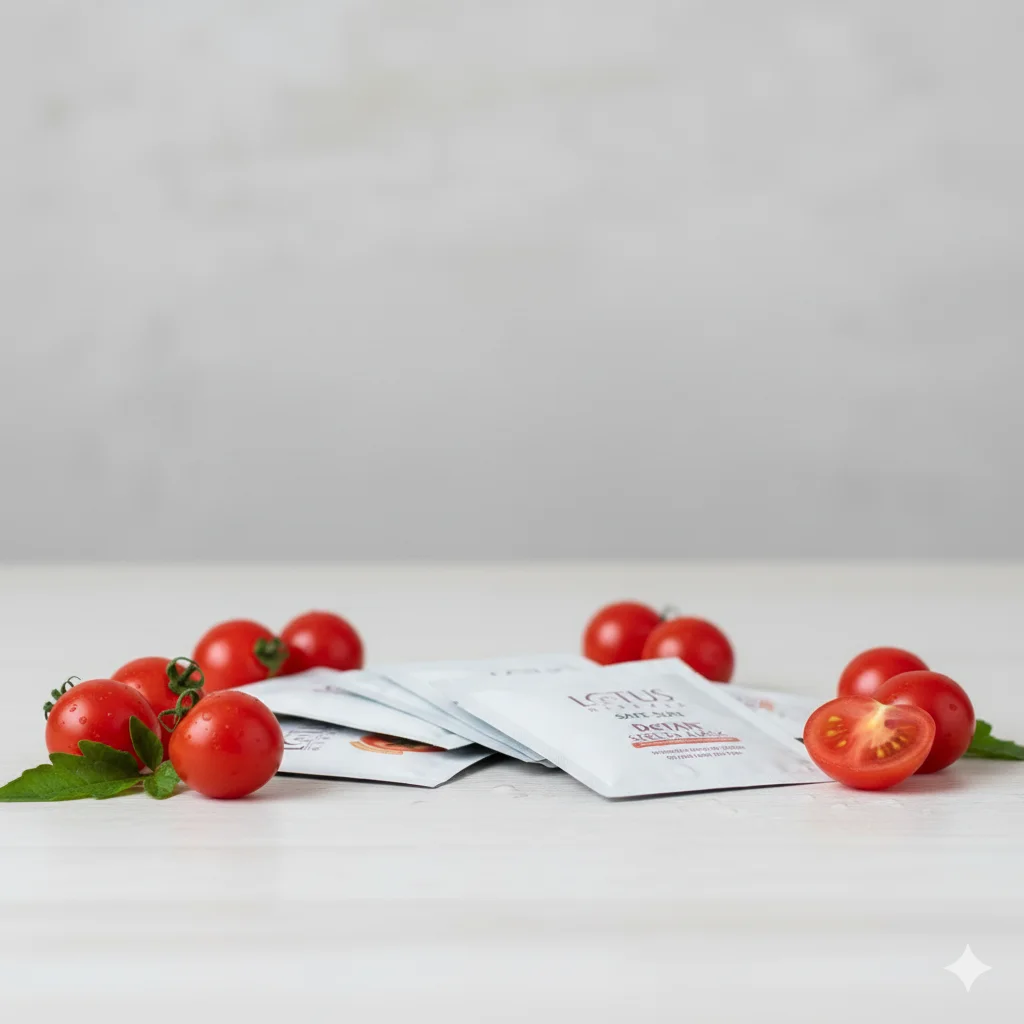 Tomato Infused: The prominent tomato imagery and actual tomatoes around the box strongly suggest tomato extract as a key active ingredient, known for its brightening properties.