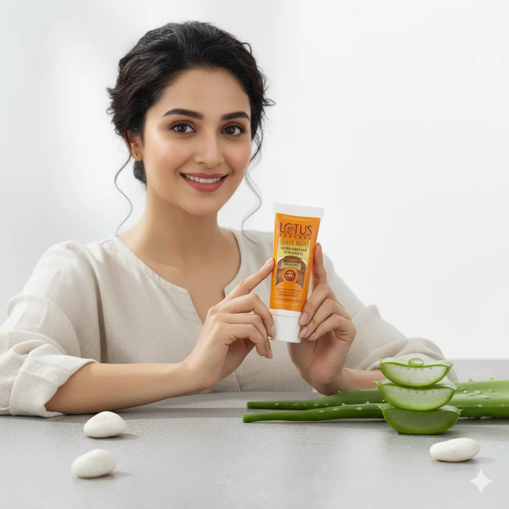 This is a tube of Lotus Herbals Safe Sun Ultra-Protect Sunscreen, boasting a very high sun protection factor of SPF 100+ and PA+++. The product comes in an orange and white tube, prominently displaying the “Lotus Herbals” logo and “Safe Sun” line. The text “Ultra-Protect Sunscreen” and the high SPF rating are clearly visible. The product is set against a soft, light background, with natural elements like green aloe vera leaves and white pebbles, suggesting a connection to natural ingredients and skin soothing properties. The overall presentation emphasizes powerful sun protection.
