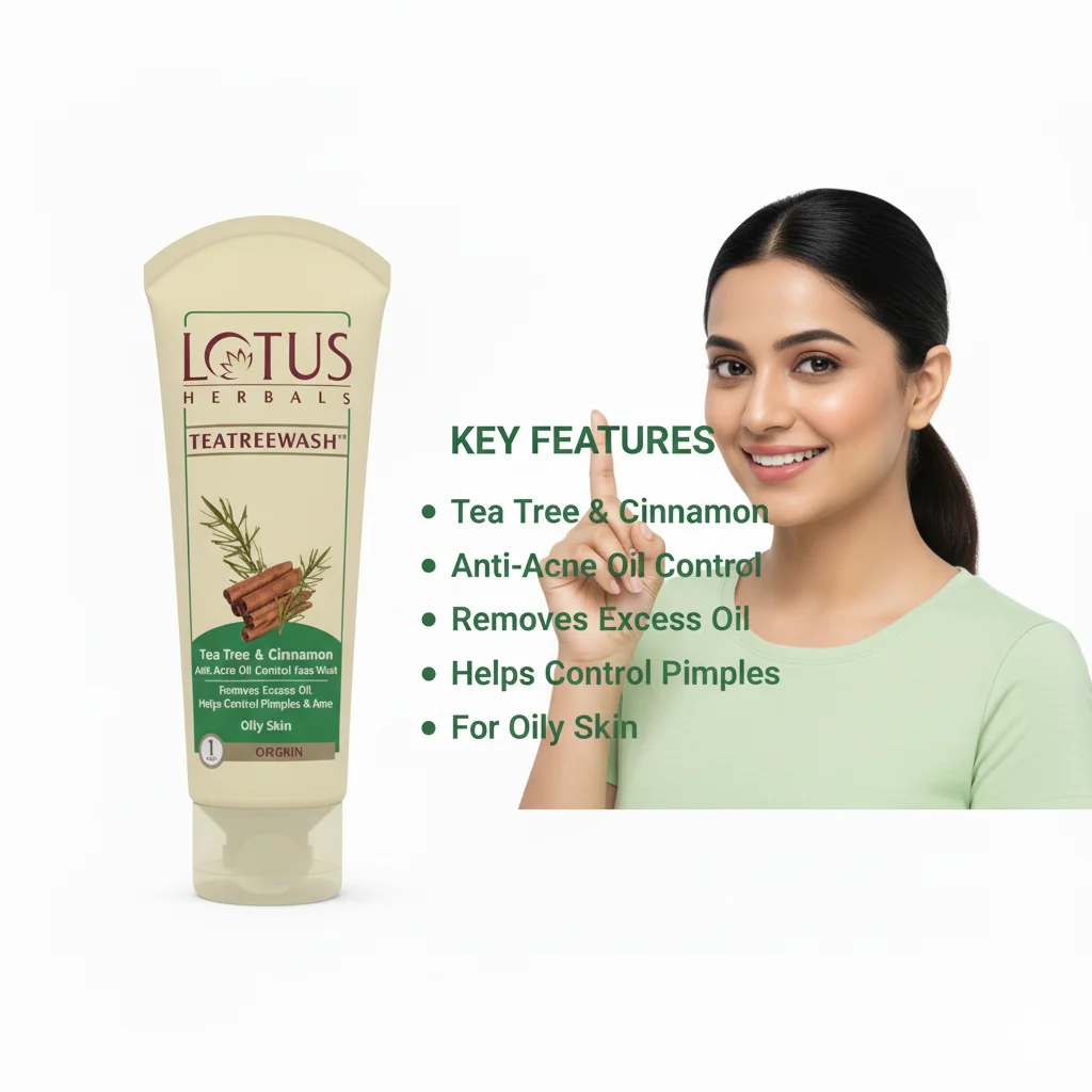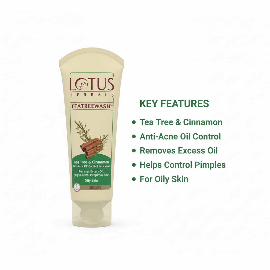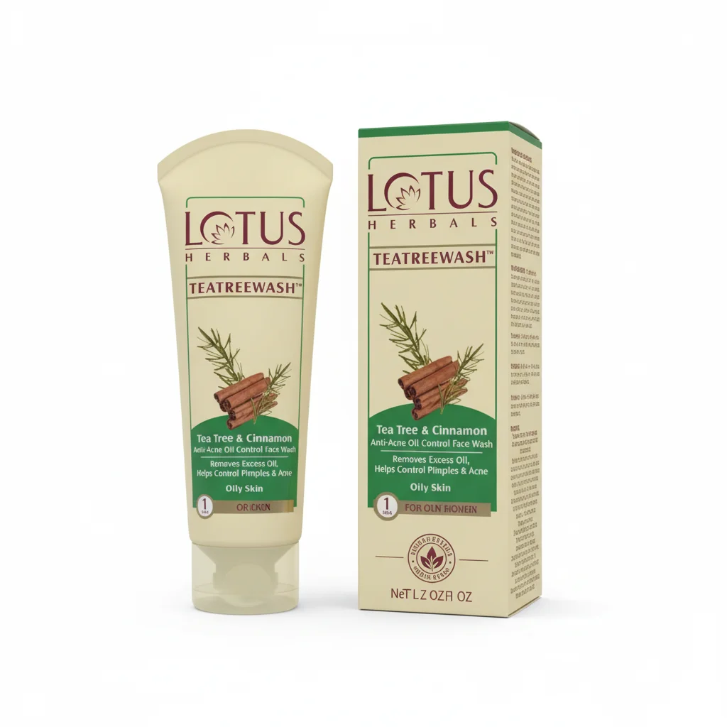 The Lotus Herbals Tea Tree & Cinnamon Teatreewash is an anti-acne and oil control face wash specifically formulated for oily skin. It comes in a squeezable tube and an accompanying box, both featuring a clean design with illustrations of tea tree leaves and cinnamon sticks, highlighting its key natural ingredients. The product’s primary function is to remove excess oil and help control pimples and acne, making it suitable for individuals struggling with these skin concerns. The “1 ORIGIN” label on the tube suggests a focus on natural or original ingredients. The packaging also indicates “NET 2 OZ,” providing information about its quantity.