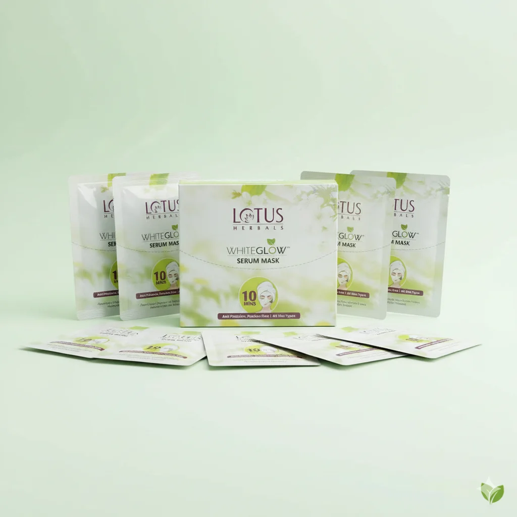 The Lotus Herbals WhiteGlow Serum Mask is a set of individual sheet masks designed to provide skin whitening and brightening benefits. The product emphasizes quick results, stating “10 Mins” which implies a fast-acting treatment. It’s formulated to be “Anti Pollution, Paraben Free” and suitable for “All Skin Types,” making it a versatile option. The image shows a box containing multiple individually packaged serum masks, suggesting a convenient and hygienic application. The “WhiteGlow” line aims to improve skin radiance and even tone.