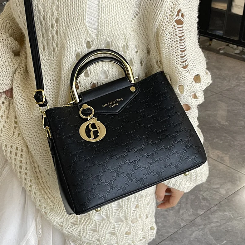 Elevate your everyday style with the Luxe Noir Monogram Handbag, crafted in a rich black finish with an elegant embossed pattern. Designed with polished gold-tone handles and signature charm detailing, this handbag blends luxury with functionality. Its structured silhouette, spacious interior, and detachable shoulder strap make it perfect for work, outings, or special occasions. A timeless accessory that adds effortless sophistication to any outfit.