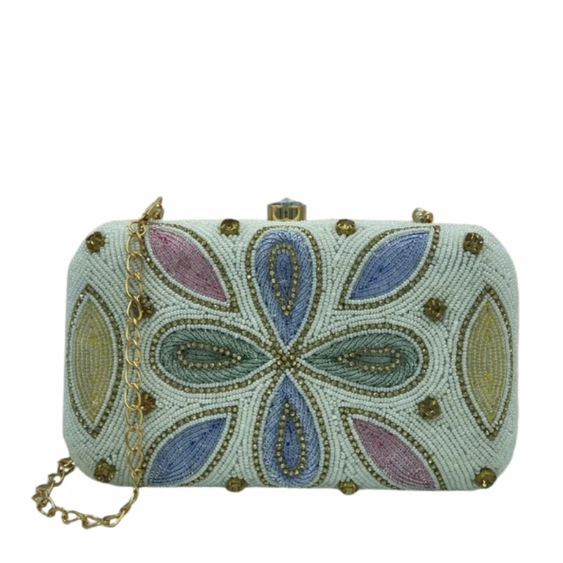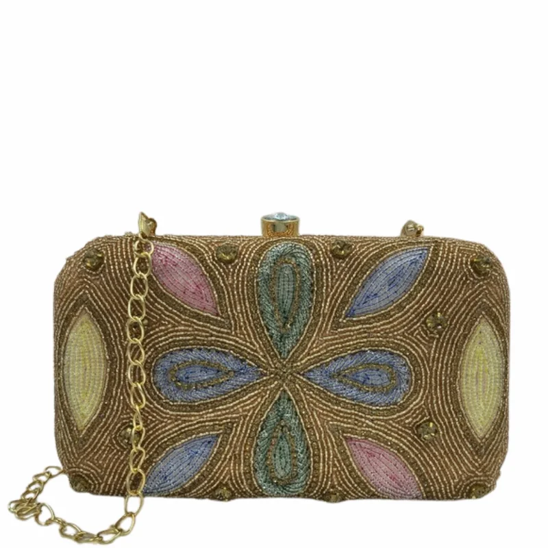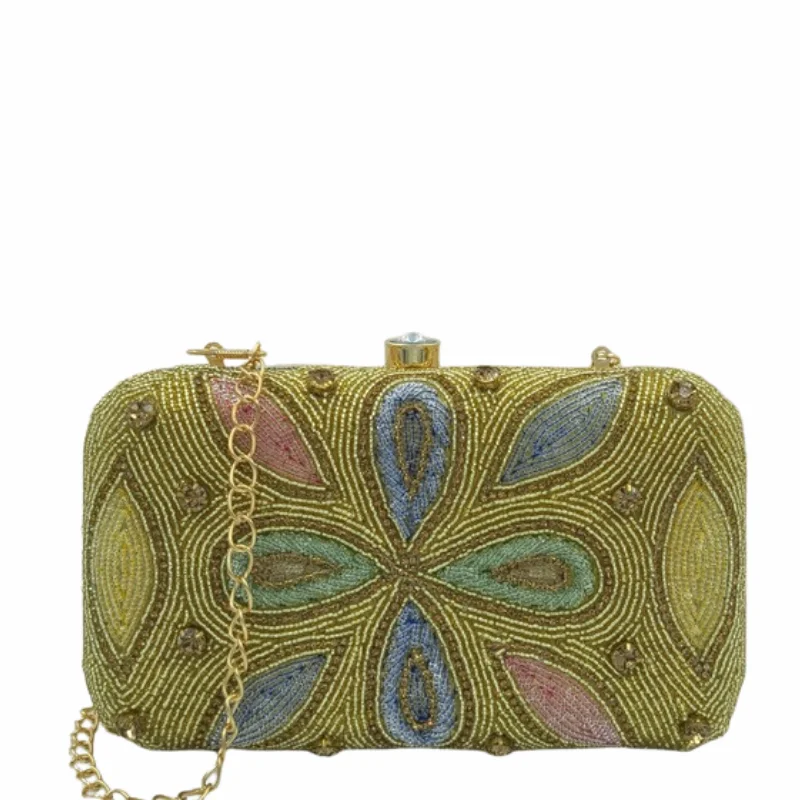 Luxurious Hand-Beaded Floral Box Clutch | Crystal Clasp Evening Bag with Detachable Gold Chain