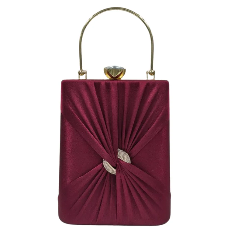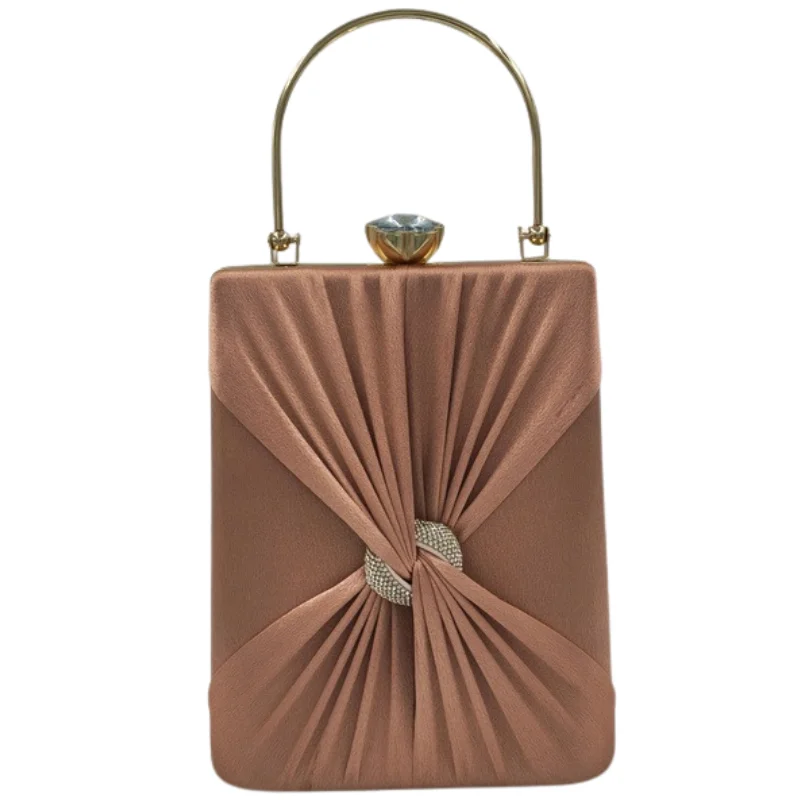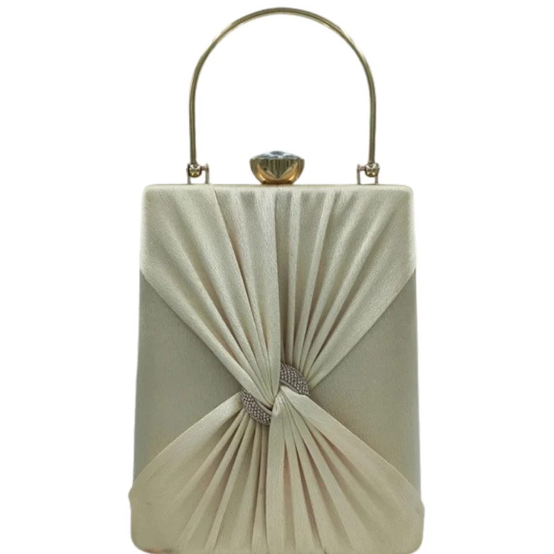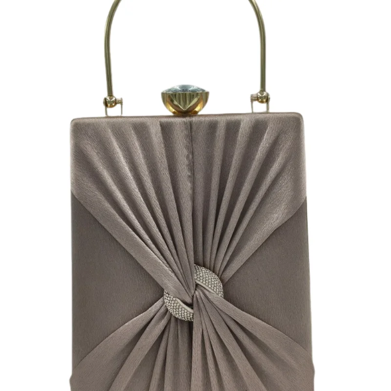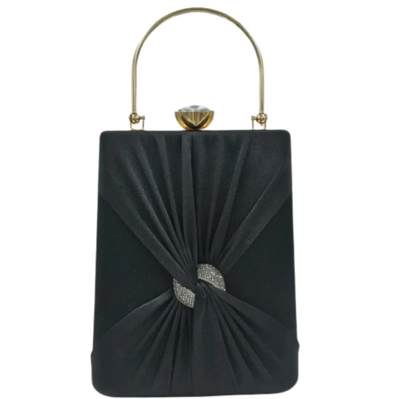 Luxurious Satin Box Clutch with Pleated Knot Design, Rhinestone Embellishment, and Crystal Clasp – Elegant Gold-Tone Evening Handbag