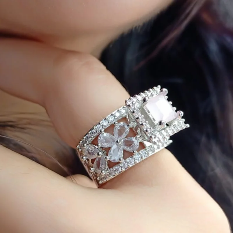 The wide shank is the true showstopper, featuring an intricate openwork design. Flanking the center stone are delicate four-petal flower motifs composed of pear-cut (teardrop) crystals, set within a “negative space” cutout that adds lightness to the substantial band. The top and bottom edges of the ring are bordered by continuous rails of pavé-set round stones, ensuring the piece catches the light from every angle. Finished with a high-polish silver tone, this cocktail ring is perfect for weddings, anniversaries, or special evenings out.
