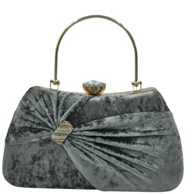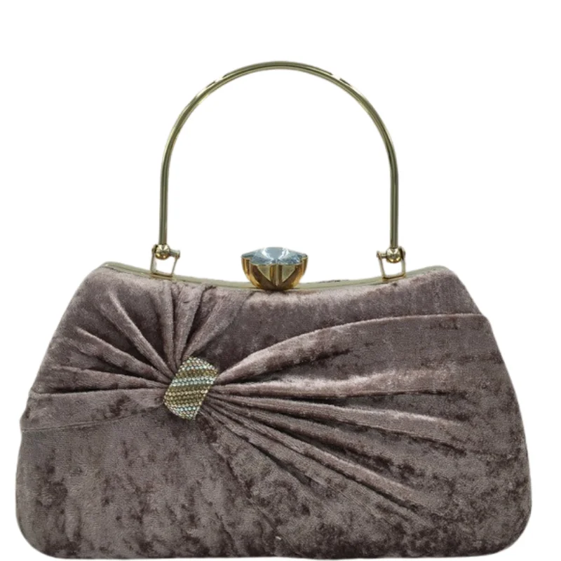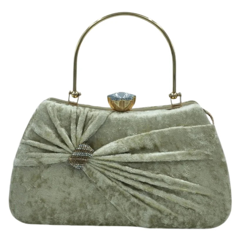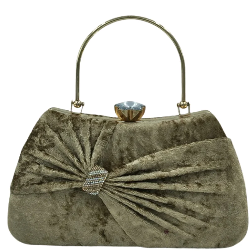 Luxury Crushed Velvet Evening Clutch Bag with Crystal Bow Detail & Gold Metal Handle – Vintage Style Party Purse