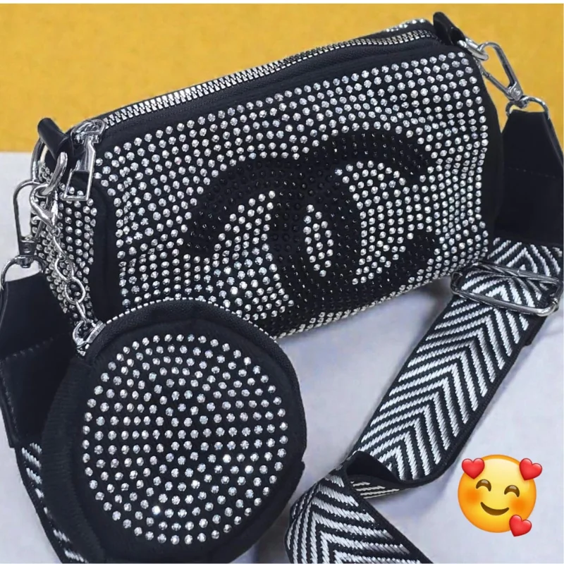 Elevate your accessory game with this dazzling 2-piece rhinestone crossbody bag set. Designed for those who love to stand out, this compact handbag is fully encrusted with shimmering silver crystals set against a black background. The center of the bag features the “DIOR” logo boldly spelled out in contrasting black rhinestones, giving it a high-end, designer-inspired aesthetic.