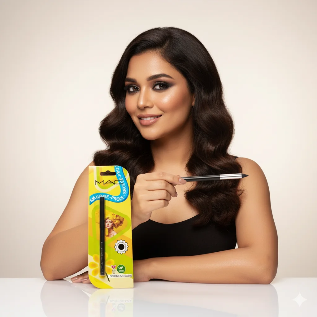 The MAC Longwear Kajal Eyeliner, as suggested by the packaging featuring “LONGWEAR KAJAL” and “SMUDGE-PROOF,” is a high-performance eyeliner designed to deliver intense, rich color that lasts all day. This kajal is crafted for effortless application, gliding smoothly along the lash line and waterline without tugging or skipping. Its smudge-proof and potentially waterproof formula ensures that your eye look remains flawless and defined, resisting fading, smudging, or creasing, even in challenging conditions. The packaging highlights “SMUDGE-PROOF” and possibly other beneficial features, indicating its suitability for creating dramatic and lasting eye looks. The model in the image is showcasing a bold, defined eye makeup, likely achieved with this product.