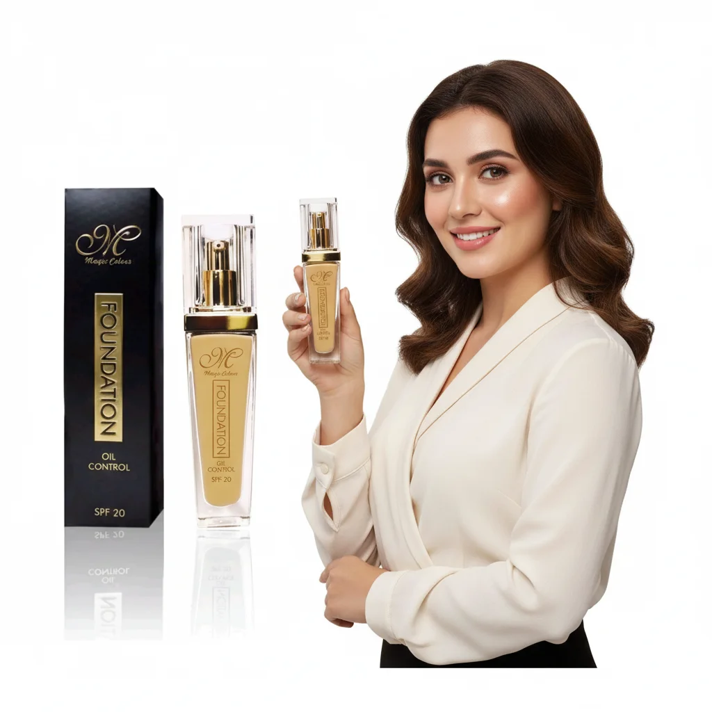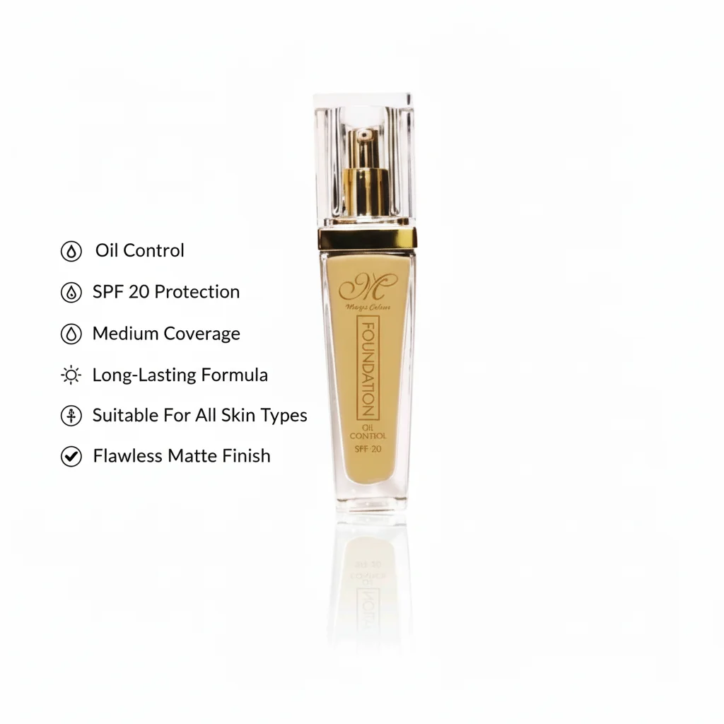 The Magic Colour Foundation is a liquid foundation designed to provide even coverage and a flawless complexion. It comes in a sleek, clear glass bottle with a gold-accented pump dispenser, reflecting a sophisticated aesthetic. The product aims to offer not just cosmetic enhancement but also skin benefits, as indicated by its key features.
