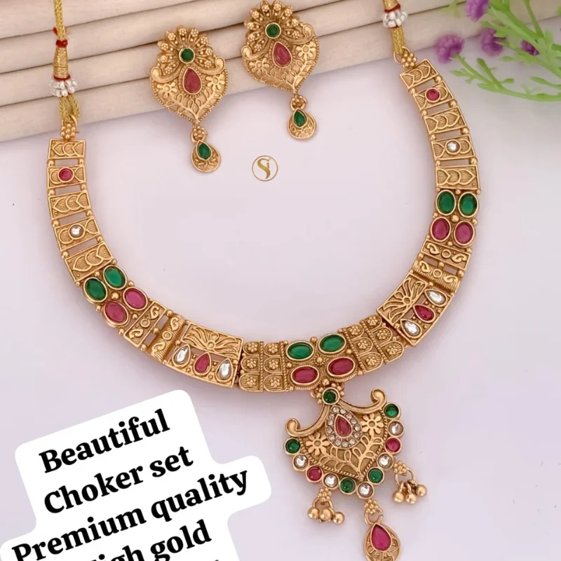 Step into the world of regal elegance with this exquisite Rajawadi choker set. Handcrafted to perfection, the necklace features a unique design of rectangular gold-plated panels, each beautifully embellished with alternating pairs of vibrant ruby-red and emerald-green stones. The rich, matte antique gold plating gives the set a sophisticated, heirloom-like feel that perfectly complements traditional attire.