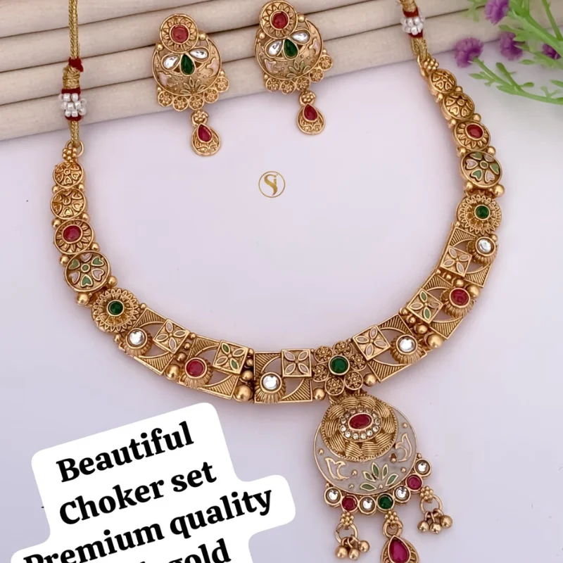 Step into elegance with this exquisite Rajwadi-style choker set, designed to capture the essence of royal Indian heritage. The necklace is crafted with a high-quality alloy base and finished with a rich antique gold plating that offers a refined, matte glow. Its unique design features a sequence of square-shaped gold panels with intricate lattice (jali) cutouts, each inset with vibrant ruby-red and emerald-green stones.