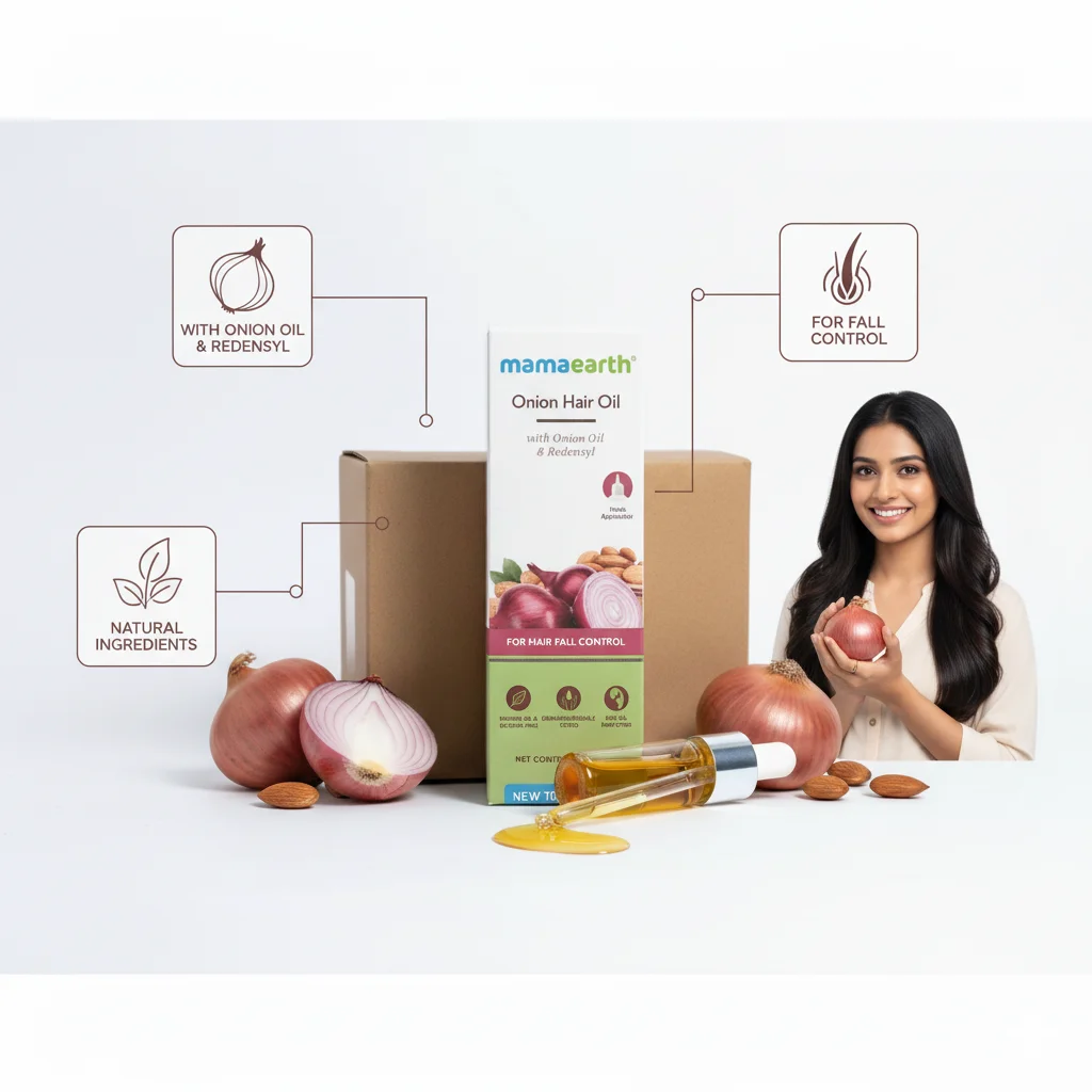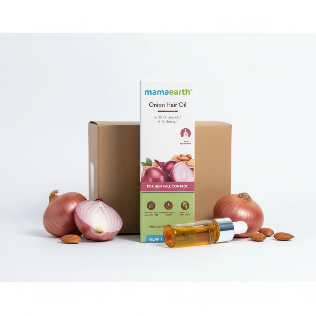 This product is Mamaearth’s Onion Hair Oil, specifically formulated with onion oil and Redensyl to help control hair fall. The image displays the product’s outer packaging box, along with a small clear bottle of the oil itself, implying the product inside. Surrounding the product are fresh onions (whole and sliced) and almonds, which are key ingredients, visually reinforcing the natural components. The packaging highlights “NEW TIN” which could refer to an updated formulation or packaging. The design is clean and informative, featuring a depiction of hair loss prevention, and lists key benefits and ingredient claims. The overall presentation suggests a natural, effective solution for hair fall concerns.