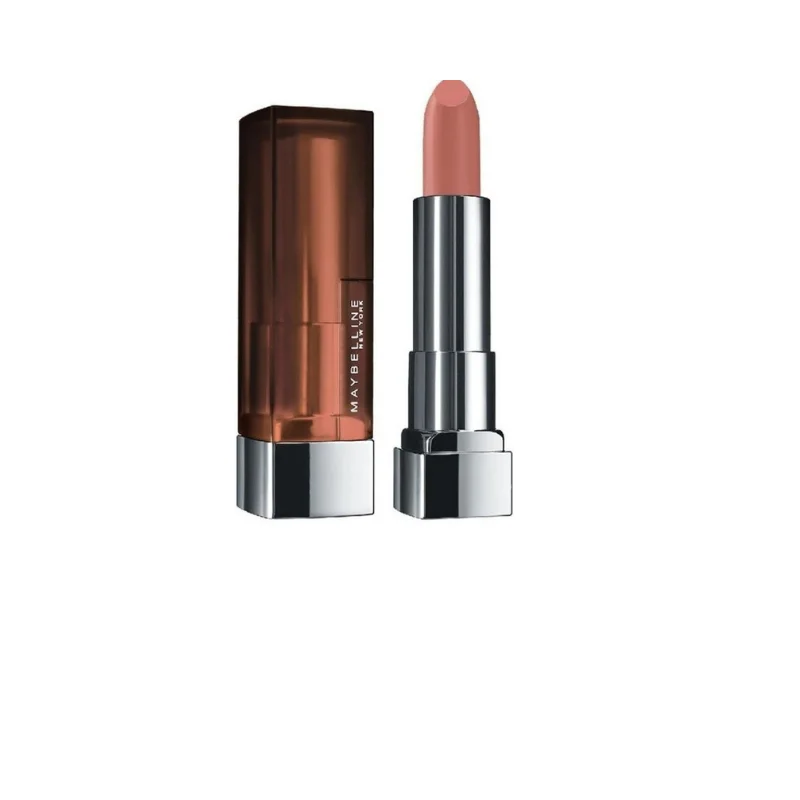 The lipstick features a velvety texture that glides on effortlessly, delivering crisp, vibrant color in a single swipe. The shade pictured is a flattering warm nude, ideal for creating a sophisticated, natural look or balancing out a dramatic eye makeup style. Housed in Maybelline’s signature chic rectangular packaging with a silver base, it is a makeup bag essential for those who want a bold look with a creamy feel.