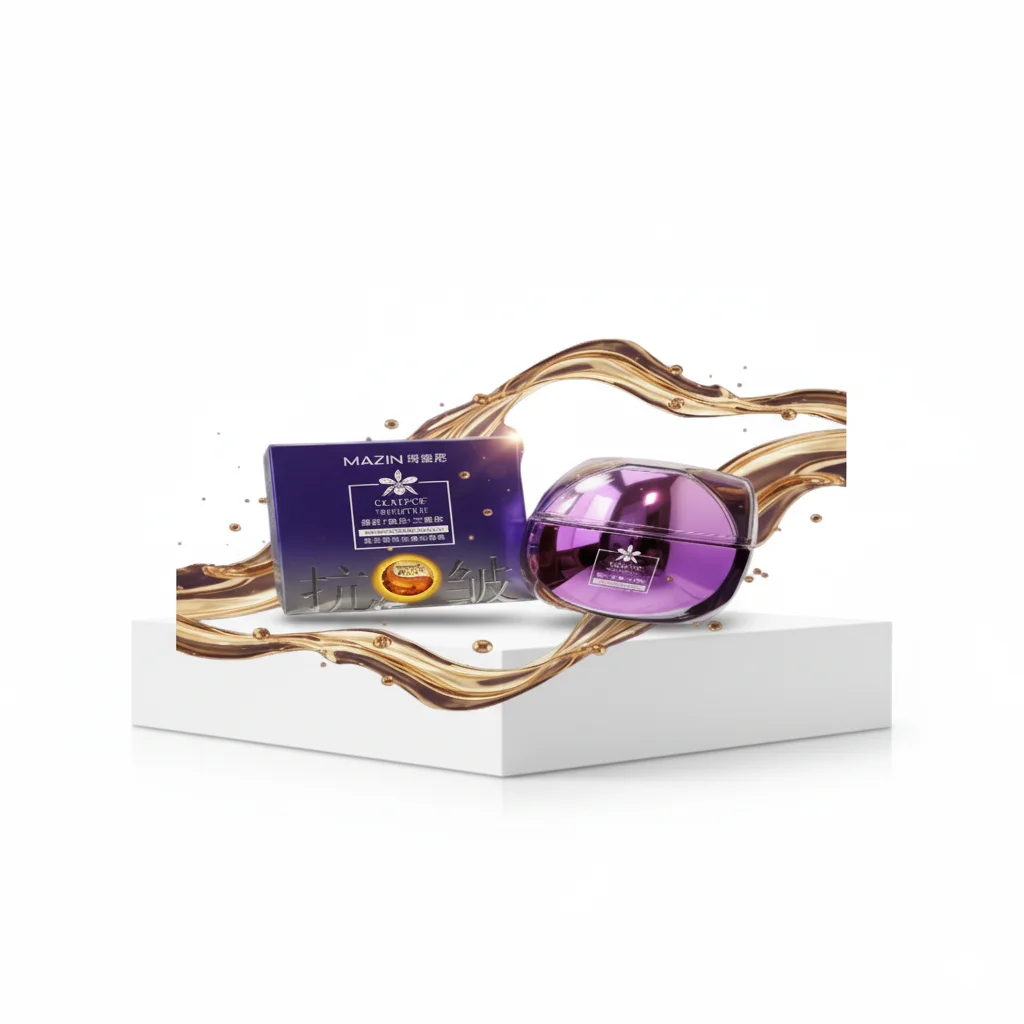 The Mazin Delicate cream is a high-end facial treatment aimed at nourishing and revitalizing the skin. Housed in a distinctive multifaceted purple jar with a matching sophisticated box, the product’s aesthetic suggests a premium formulation. The name “CICATFCE,” likely a stylized version of the French word “cicatrice” meaning scar, hints at reparative properties that may help in diminishing imperfections and promoting skin renewal. Combined with “DELICATE,” the name implies a potent yet gentle formula suitable for various skin types. The Chinese characters “弹润” (tán rùn) and “抗皱” (kàng zhòu) visible on the packaging translate to “supple/moisturizing” and “anti-wrinkle,” respectively, explicitly stating its primary functions.