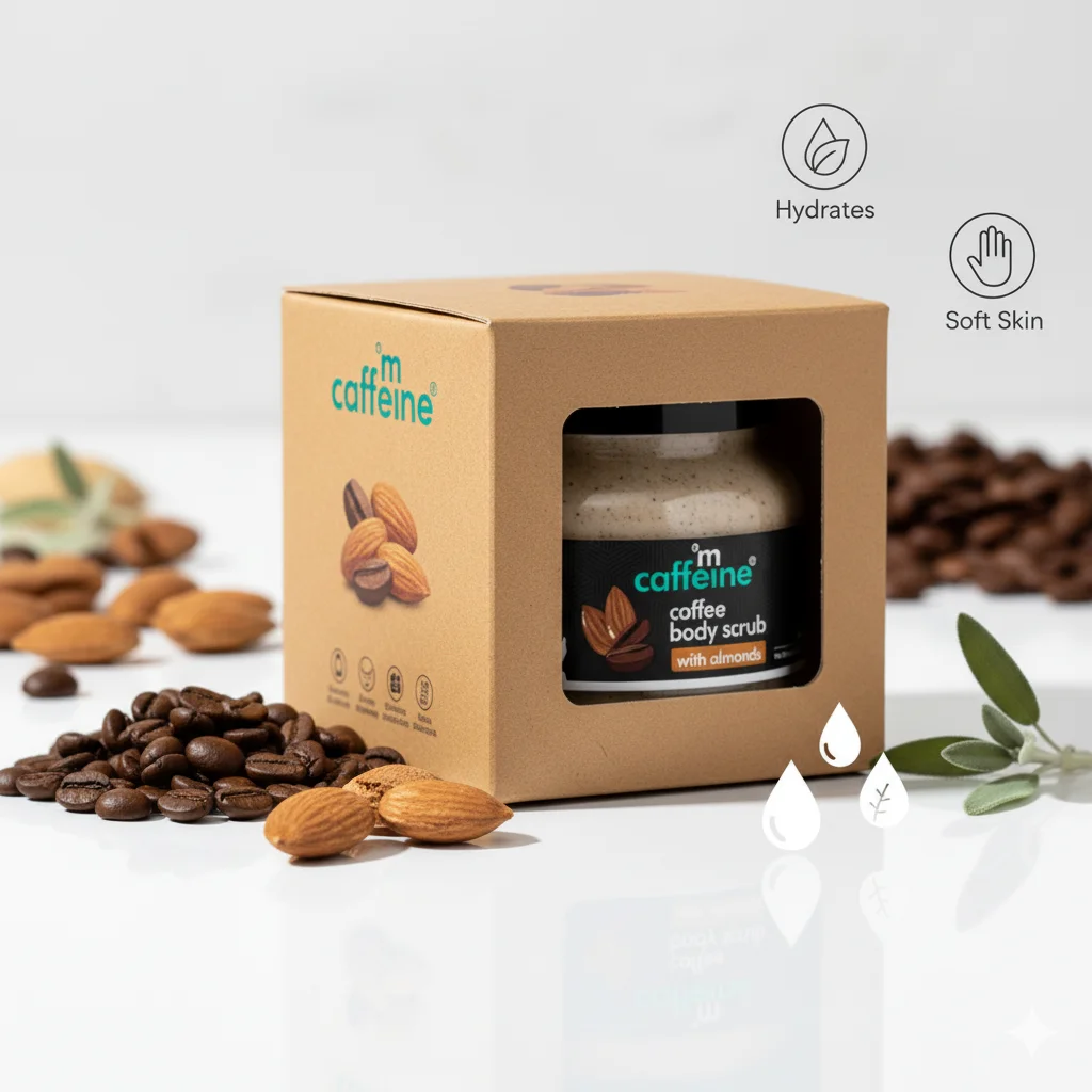 The mCaffeine Coffee Body Scrub with Almonds is an exfoliating body treatment designed to remove dead skin cells, deeply cleanse, and leave the skin feeling smooth, soft, and hydrated. It is presented in eco-friendly kraft paper packaging with a clear window that showcases the product inside – a jar filled with the coffee and almond scrub. The product highlights key benefits like “Hydrates” and “Soft Skin” with illustrative icons. The scrub is infused with coffee, known for its exfoliating and antioxidant properties, and enriched with almonds, likely providing moisturizing and nourishing benefits, while also adding to the exfoliating texture. Coffee beans and almonds are scattered around the product, visually emphasizing its natural ingredients.