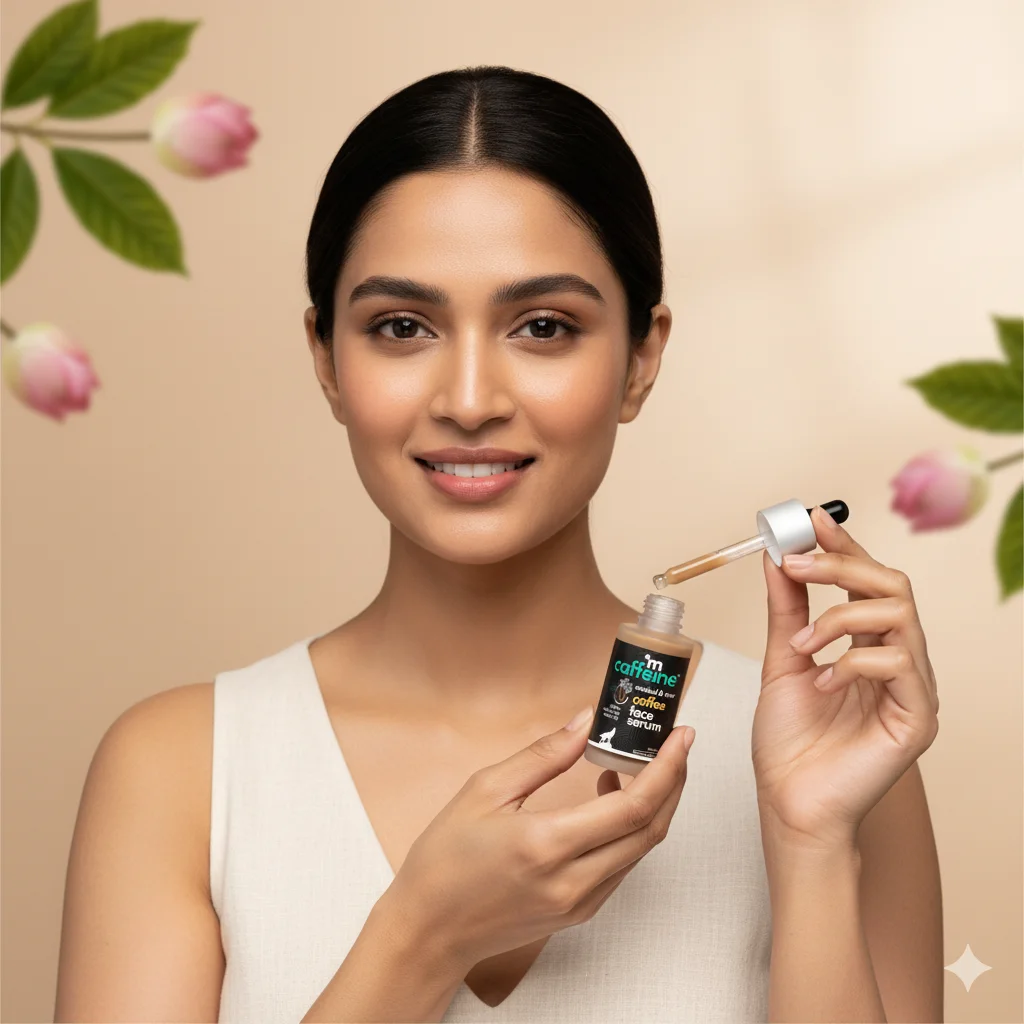 The mCaffeine Naked & Raw Coffee Face Serum is a skincare product designed to provide intense hydration, reduce dark spots, and improve skin texture, leaving the skin glowing and healthy. It comes in a dark, cylindrical packaging tube with a matching brown-tinted glass dropper bottle. The serum is infused with coffee, known for its antioxidant properties, and enriched with white water lily, an ingredient often used for its soothing and brightening effects. It’s suitable for all skin types and emphasizes being natural, cruelty-free, and possibly vegan (indicated by symbols on the packaging). The dropper applicator ensures precise and hygienic dispensing of the serum.