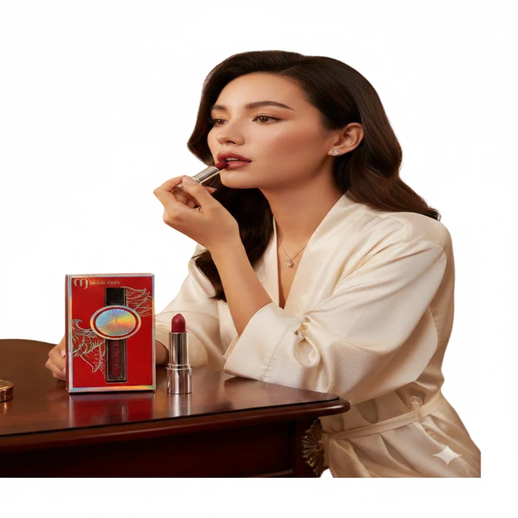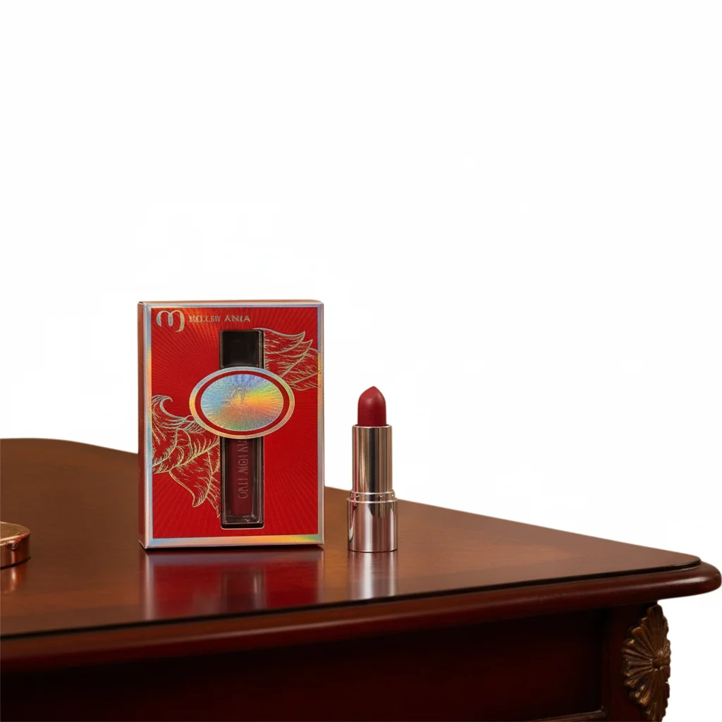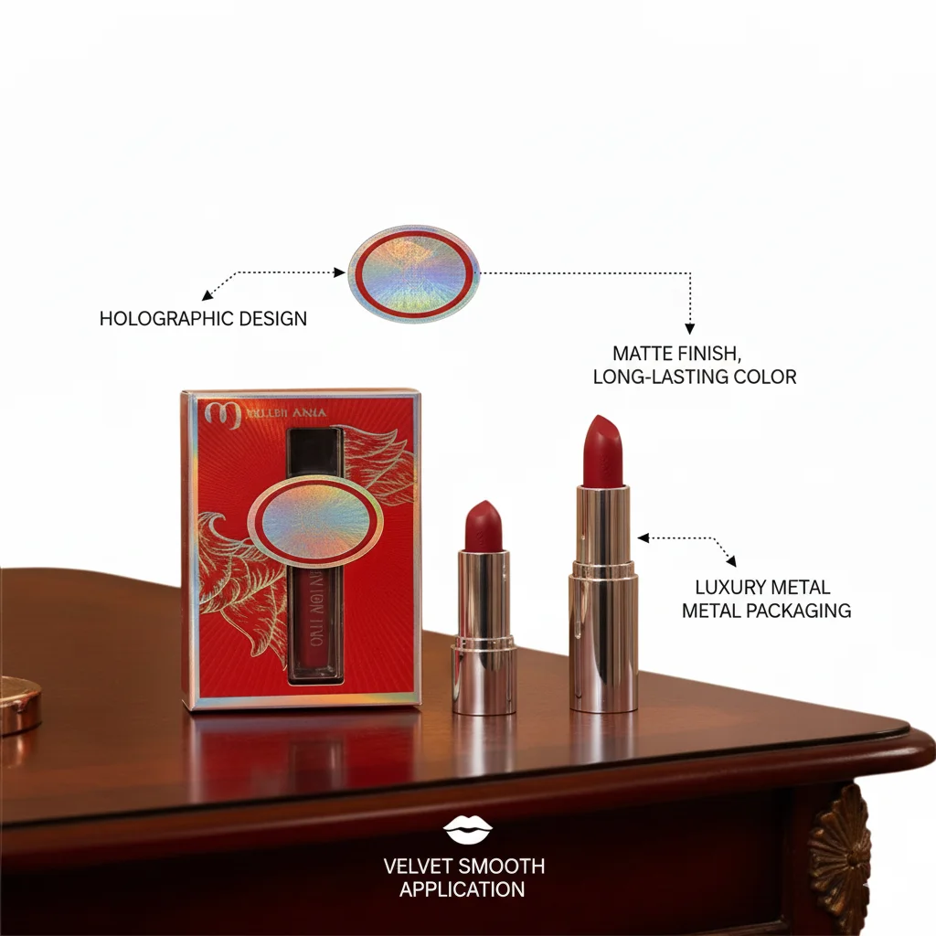 This Mellow Ania lipstick, presented in striking “Orion Vivo” packaging, offers a classic and vibrant red lip color. The product is encased in a sleek, silver tube, suggesting a timeless and sophisticated aesthetic. It is showcased alongside its eye-catching retail box, which features a radiant red design with intricate silver leaf-like patterns and a holographic oval accent, adding a modern and luxurious feel.