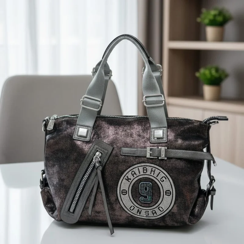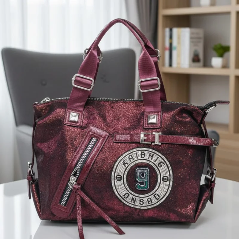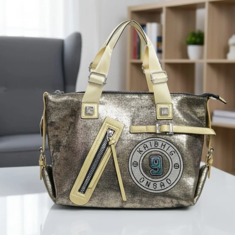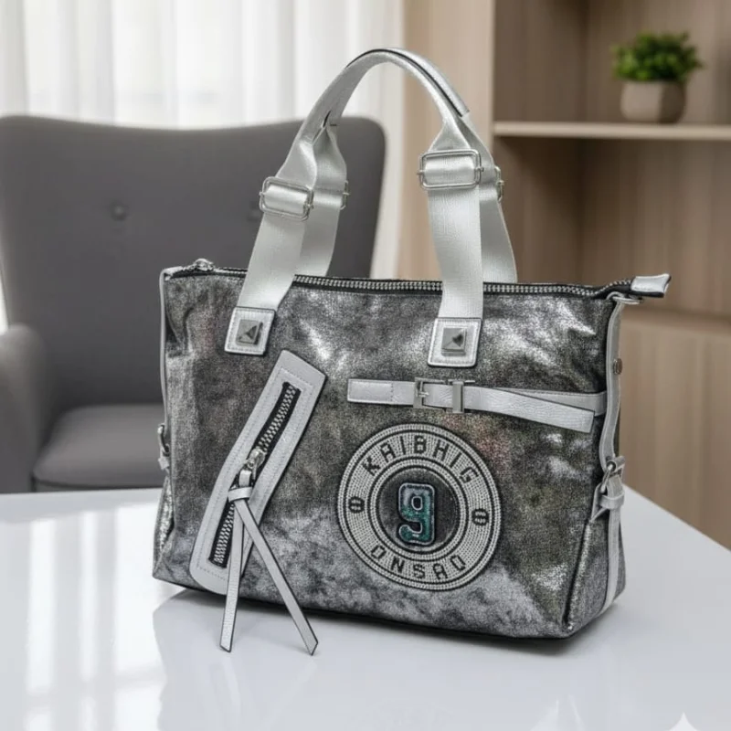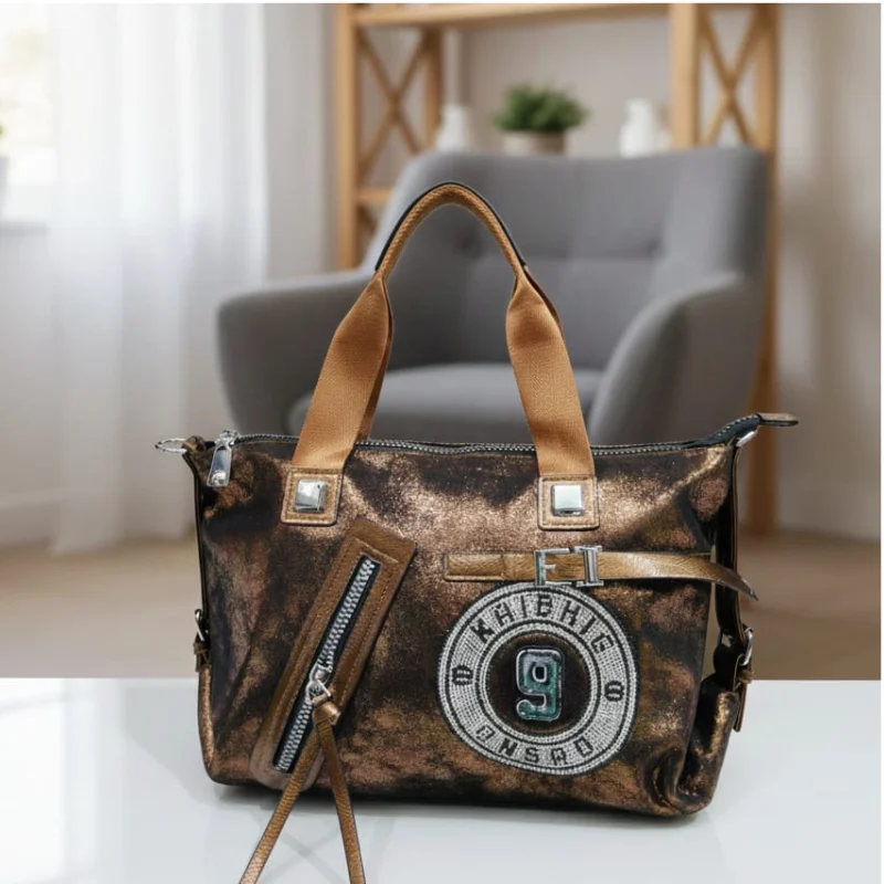 Metallic Sporty-Chic Handbag with “9” Varsity Patch