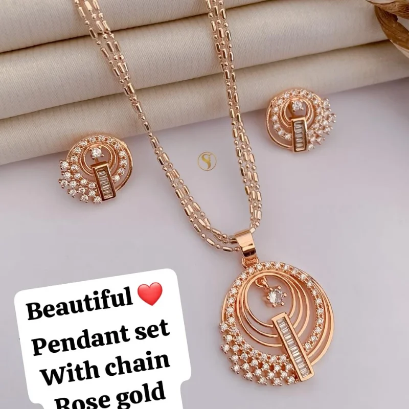 Elevate your style with this exquisitely crafted rose gold-toned jewelry set, designed for the fashion-forward woman. The centerpiece is a stunning circular pendant featuring a multi-layered, concentric circle design. The architectural aesthetic is highlighted by a sleek vertical bar set with baguette-cut stones, while a cluster of shimmering round cubic zirconia accents the outer edge. A delicate, solitaire-style stone hangs gracefully at the top center, adding a touch of classic movement.