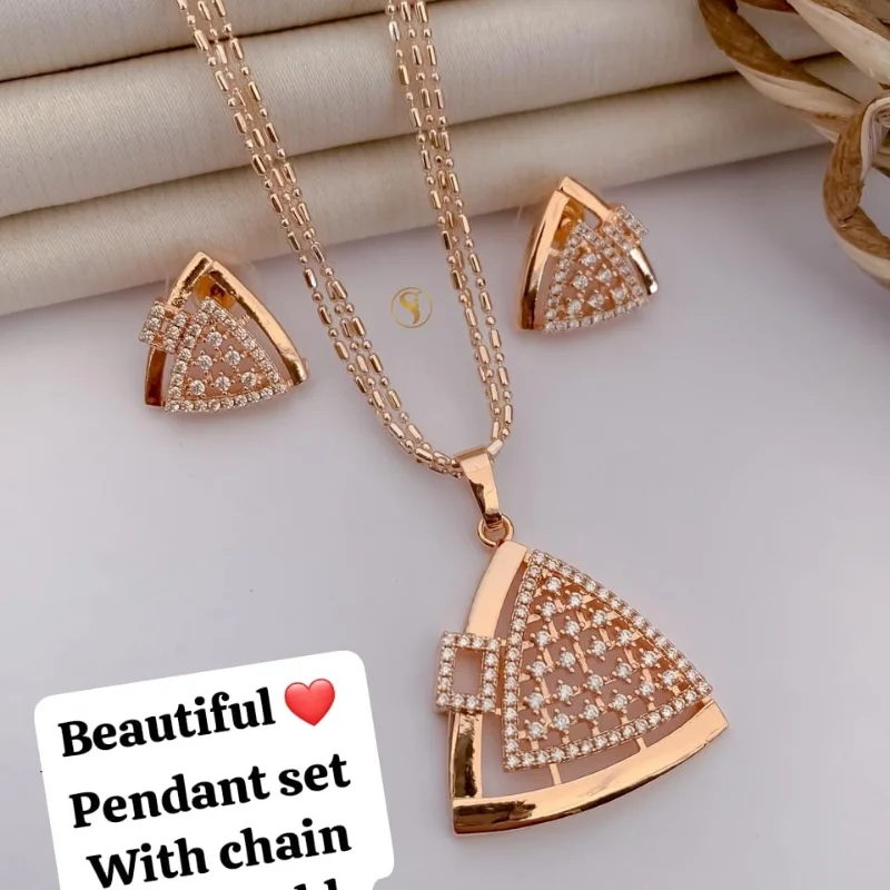 Make a bold yet sophisticated statement with this contemporary rose gold-toned jewelry set. This designer collection features a striking triangular geometric pendant with a unique fan-like silhouette. The centerpiece of the triangle is an intricate grid-style mesh, densely studded with shimmering clear cubic zirconia stones that catch the light beautifully. A sleek, polished rose gold border and a modern rectangular accent at the top add an architectural touch to the design.