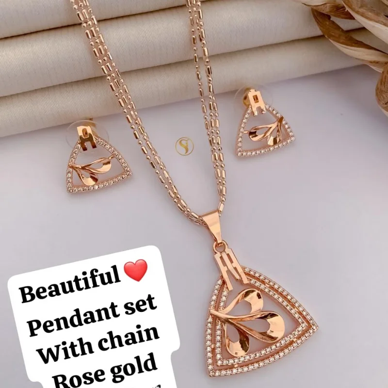 The pendant is elegantly suspended from a signature double-strand beaded chain, which offers a trendy layered look and a more textured finish than traditional link chains. To complete the ensemble, the set includes a pair of matching triangular stud earrings that perfectly mirror the pendant’s detailed craftsmanship and stone-studded elegance. This versatile set is the perfect choice for the modern woman, adding a polished and luxurious finish to everything from professional office attire to elegant evening gowns and festive wear.