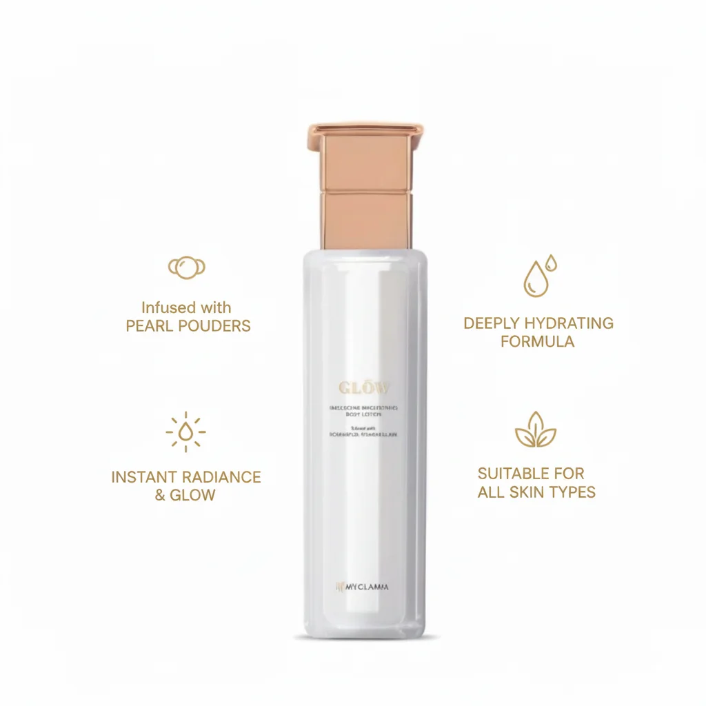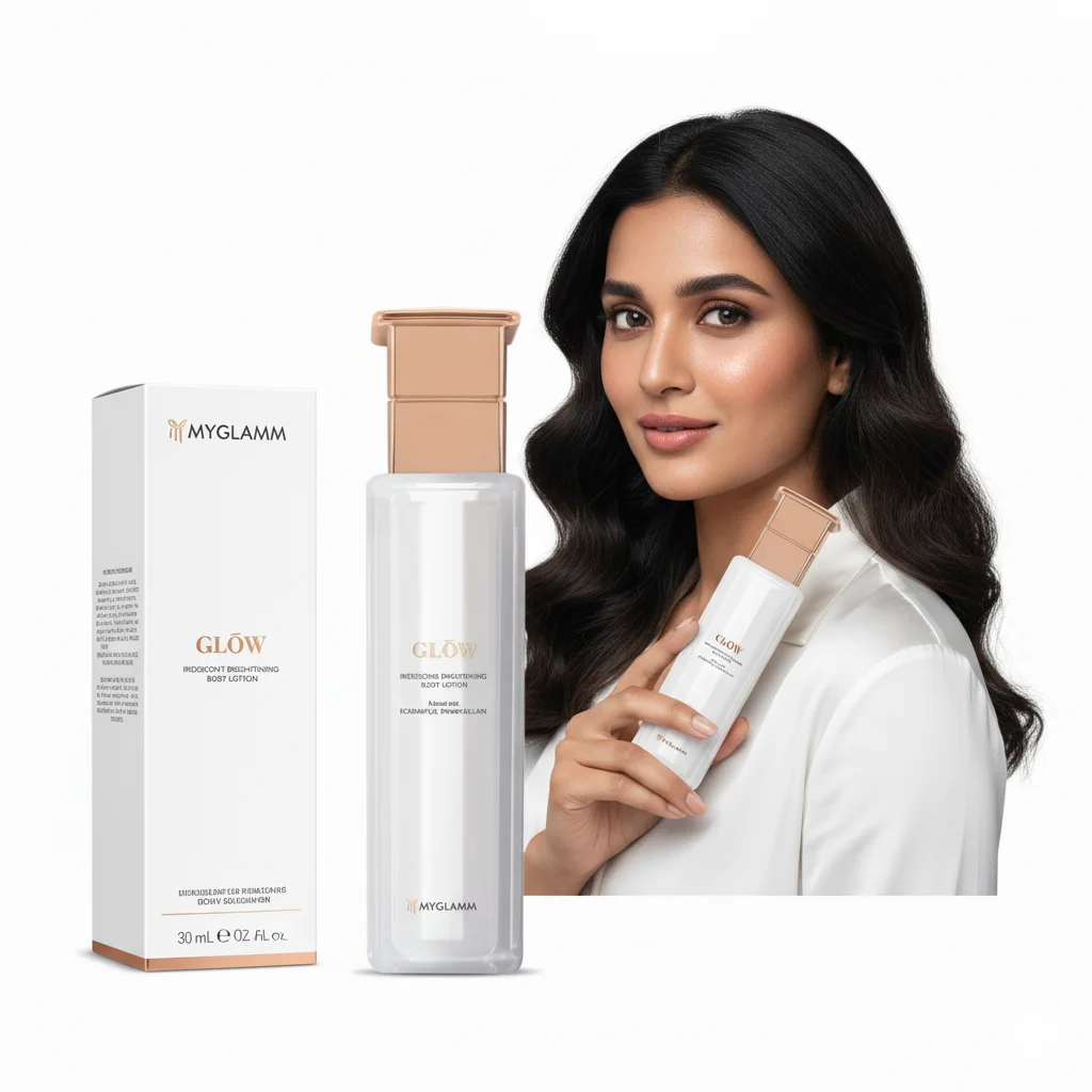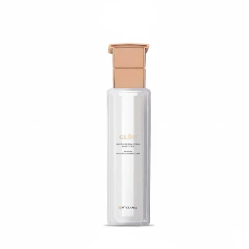 This product is an iridescent brightening body lotion from MyGlamm’s “GLOW” range. The packaging is sleek and luxurious, featuring a tall, slender bottle with a unique, possibly pump-action, rose gold dispenser, consistent with the premium aesthetic of the MyGlamm “Glow” line. The bottle and accompanying box are predominantly white, suggesting purity and radiance, with rose gold accents adding a touch of elegance. The “Iridescent Brightening” claim indicates that the lotion not only moisturizes but also imparts a subtle, shimmering glow to the skin, enhancing its radiance. The model’s luminous complexion visually reinforces the product’s ability to create a healthy, glowing look. The lightweight appearance of the lotion in the bottle suggests it will be easily absorbed, providing a smooth, non-greasy finish.