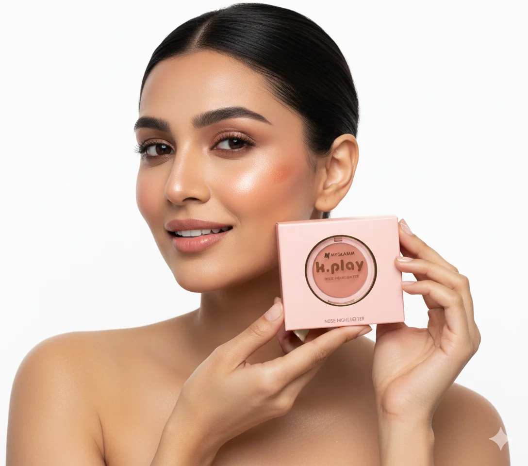 This product is a nose highlighter from MyGlamm’s “K.Play” line, specifically designed to add a subtle glow and definition to the nose. The highlighter comes in a compact, square-shaped pale pink box, suggesting a playful yet sophisticated aesthetic. The product itself appears to be a pressed powder in a circular pan, visible through a cutout on the box. The shade shown is a warm, peachy-pink tone, likely universal or suited for lighter to medium skin tones. The model in the image demonstrates a beautifully sculpted nose with a soft, natural-looking highlight, indicating the product’s ability to enhance facial features without being overly glittery. The packaging is minimalist and chic, appealing to consumers looking for targeted makeup solutions.