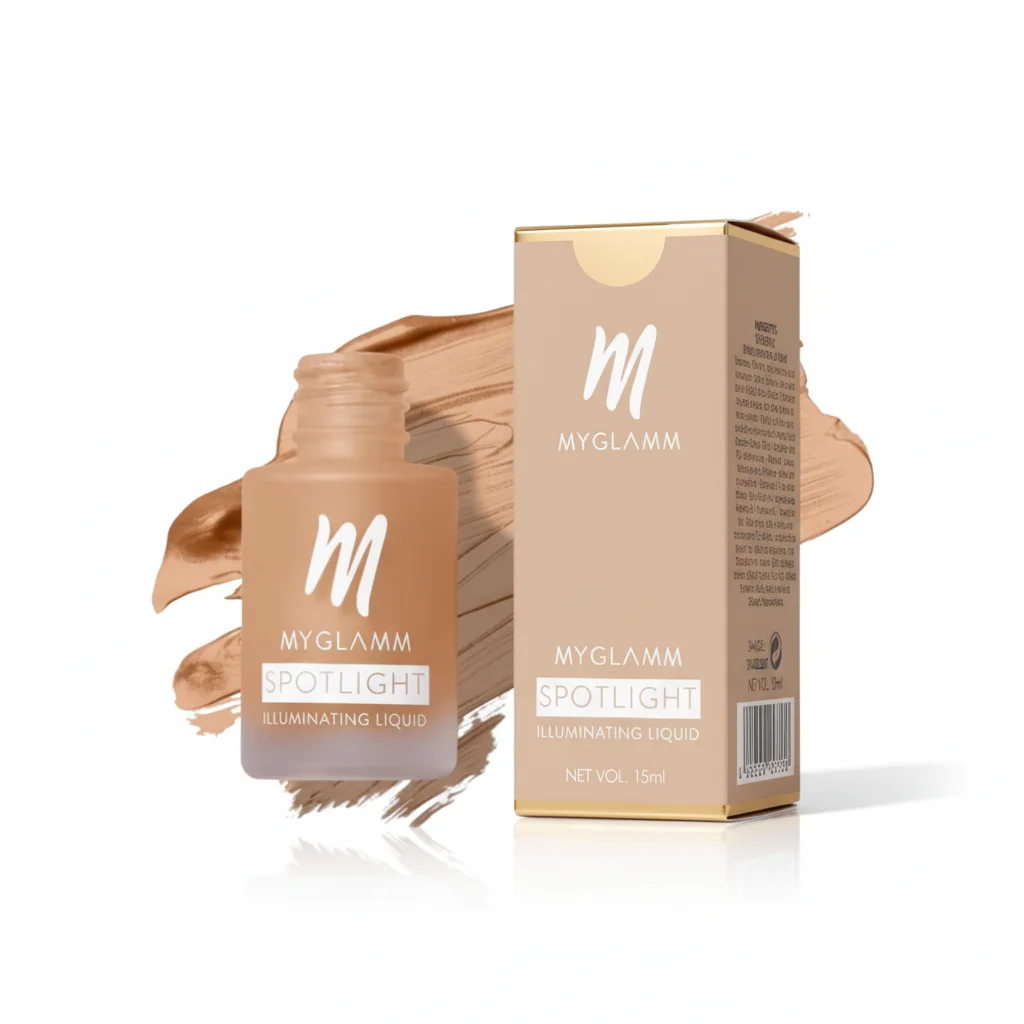 This product is a liquid illuminator designed to impart a radiant glow to the skin. It comes in a frosted glass bottle with a dropper applicator, suggesting a precise and controlled application of the liquid formula. The packaging, in shades of nude and gold, aligns with a sophisticated and premium aesthetic, similar to the previous MyGlamm product. The model’s glowing complexion further emphasizes the product’s intended effect of adding luminosity. The accompanying box provides essential product information and reinforces the brand identity. The liquid itself appears to be a foundation-like consistency, suggesting it can be used on its own, mixed with foundation, or applied as a highlighter.