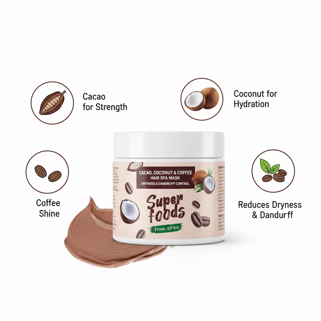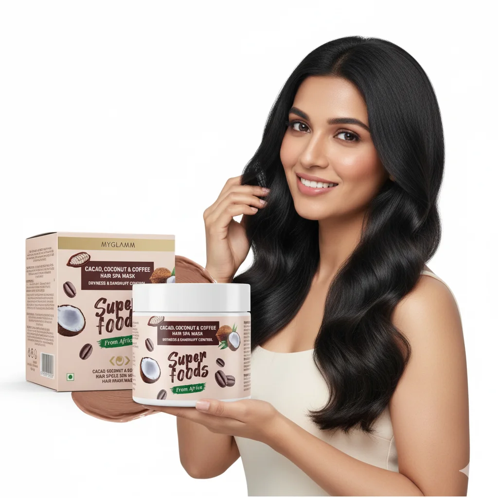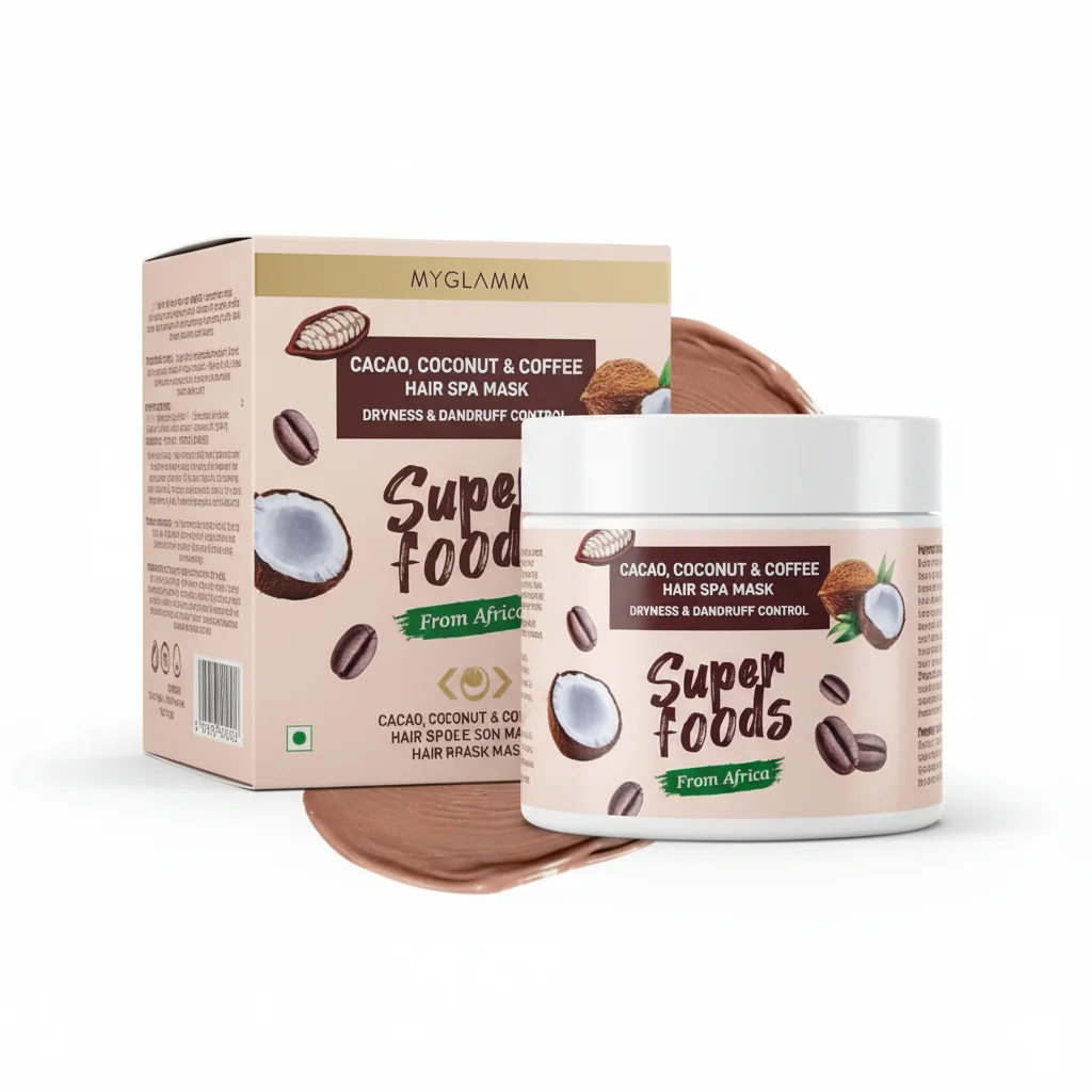 This product is a hair spa mask from MyGlamm’s “Superfoods” line, enriched with Cacao, Coconut, and Coffee. The packaging is consistent with the other “Superfoods From Africa” range, featuring a warm, natural aesthetic with illustrations of cacao pods, coffee beans, and coconut halves. The product comes in a wide-mouthed jar, typical for hair masks, indicating a thick, rich consistency designed for intensive treatment. A swatch of the product, visible behind the jar, shows a creamy, brownish texture, aligning with the cacao and coffee ingredients. This hair mask aims to provide a deep conditioning treatment, specifically targeting dryness and dandruff, suggesting a comprehensive approach to hair and scalp health.