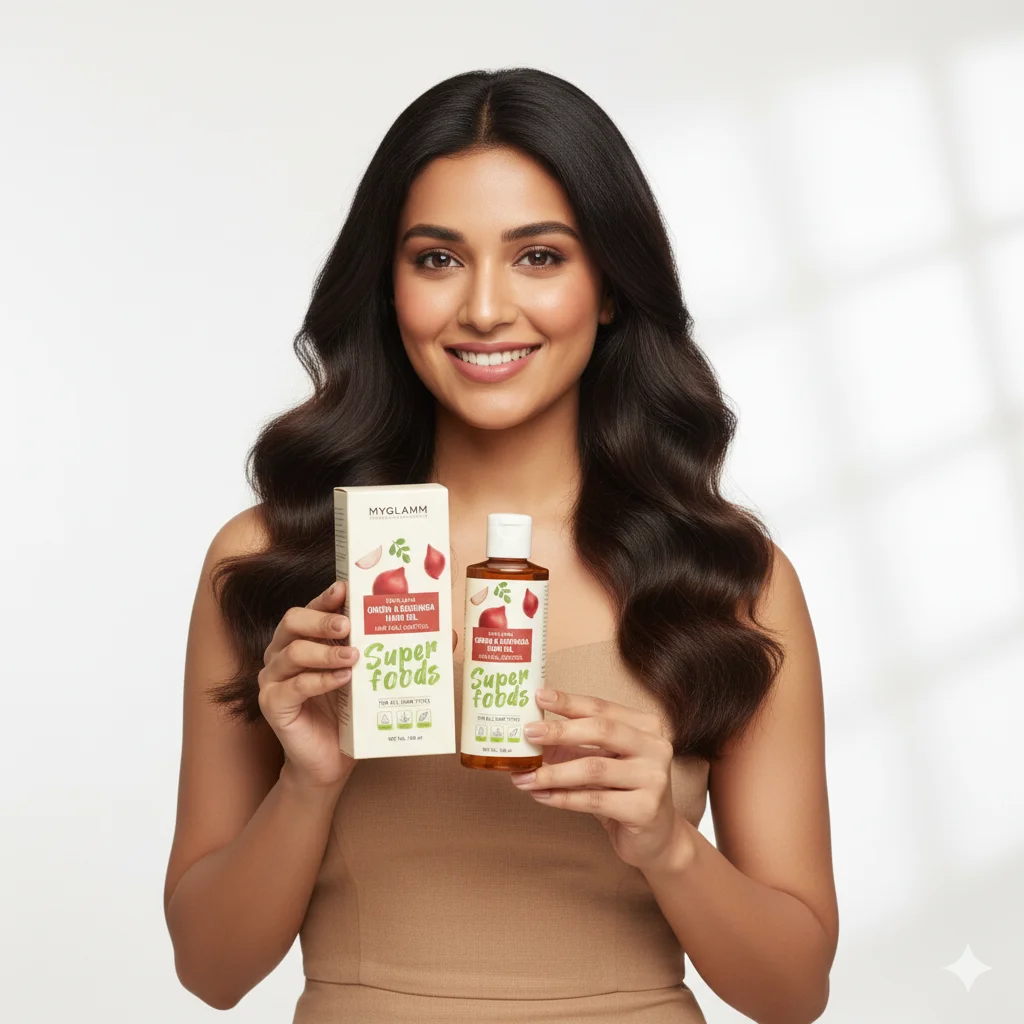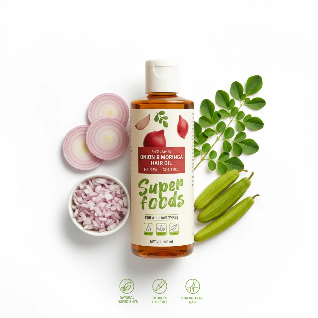 This product is a hair oil from MyGlamm’s “Superfoods” line, specifically formulated with Onion and Moringa. The packaging features a natural and earthy aesthetic, consistent with the “Superfoods” range, showcasing illustrations of onions and moringa leaves against a light background with hints of green. The phrase “For All Hair Types” is visible, indicating its universal applicability. The product comes in a transparent bottle with a flip-top cap, suggesting a liquid oil consistency. The model’s healthy, lustrous hair visually reinforces the product’s promise of nourished hair. The overall presentation emphasizes natural ingredients for hair health, appealing to those seeking solutions for common hair concerns, possibly including hair fall (implied by onion oil’s common benefits).