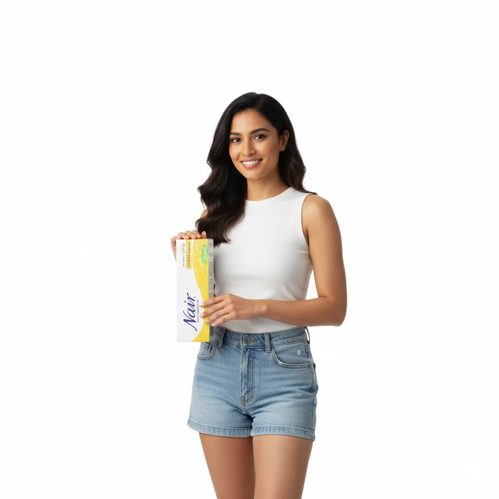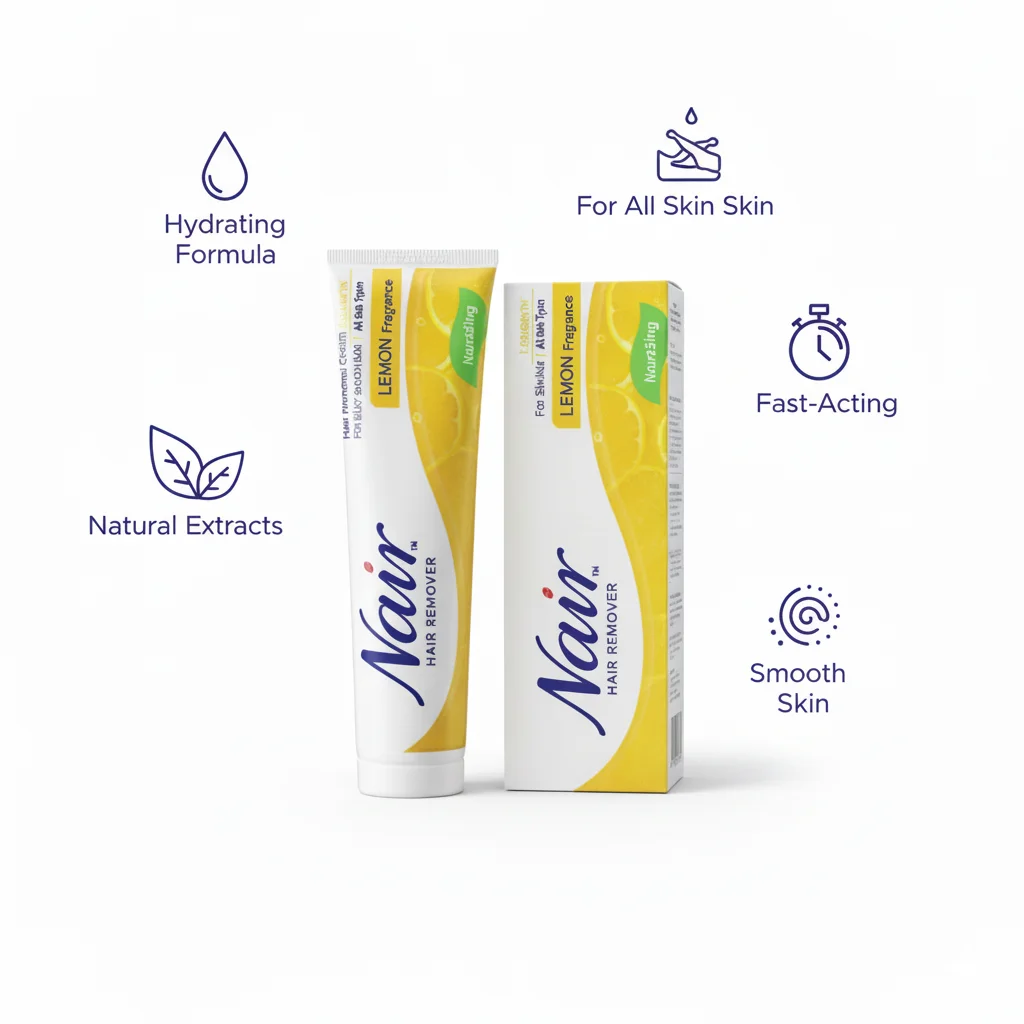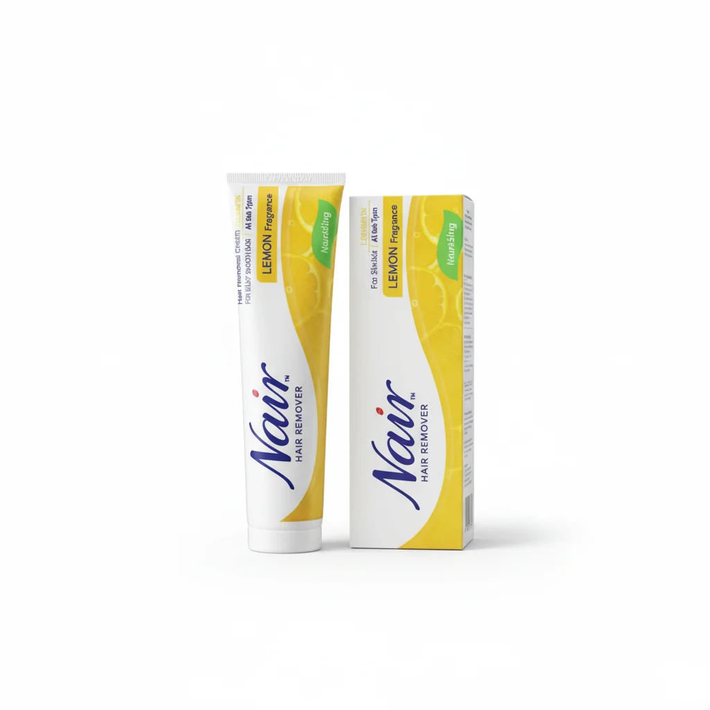 This product is Nair Hair Remover, a depilatory cream designed to remove unwanted hair. It features a “Lemon Fragrance,” likely to provide a more pleasant scent during use compared to traditional hair removal creams. The packaging indicates it is “Nourishing,” suggesting it may contain ingredients to condition the skin. The product comes in a tube and is packaged in a box, both adorned with a vibrant yellow and white design, featuring lemons to highlight its fragrance. The brand name “Nair” is prominently displayed. The packaging also includes instructions for use, mentioning “For Smooth Skin At Each Time.”