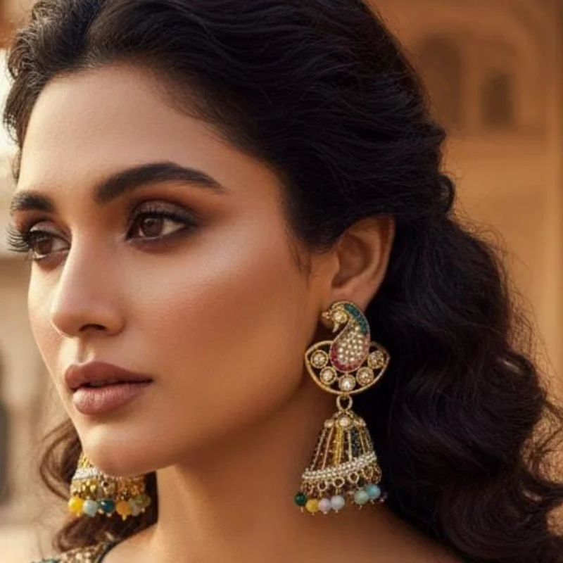Infuse your festive look with timeless charm and vibrant artistry with these Navratna-Inspired Peacock Motif Jhumka Earrings. These statement-making pieces are a celebration of traditional Indian craftsmanship, featuring a majestic peacock stud at the crown. The peacock is intricately detailed with colorful stones and delicate pearl accents, symbolizing grace and beauty.