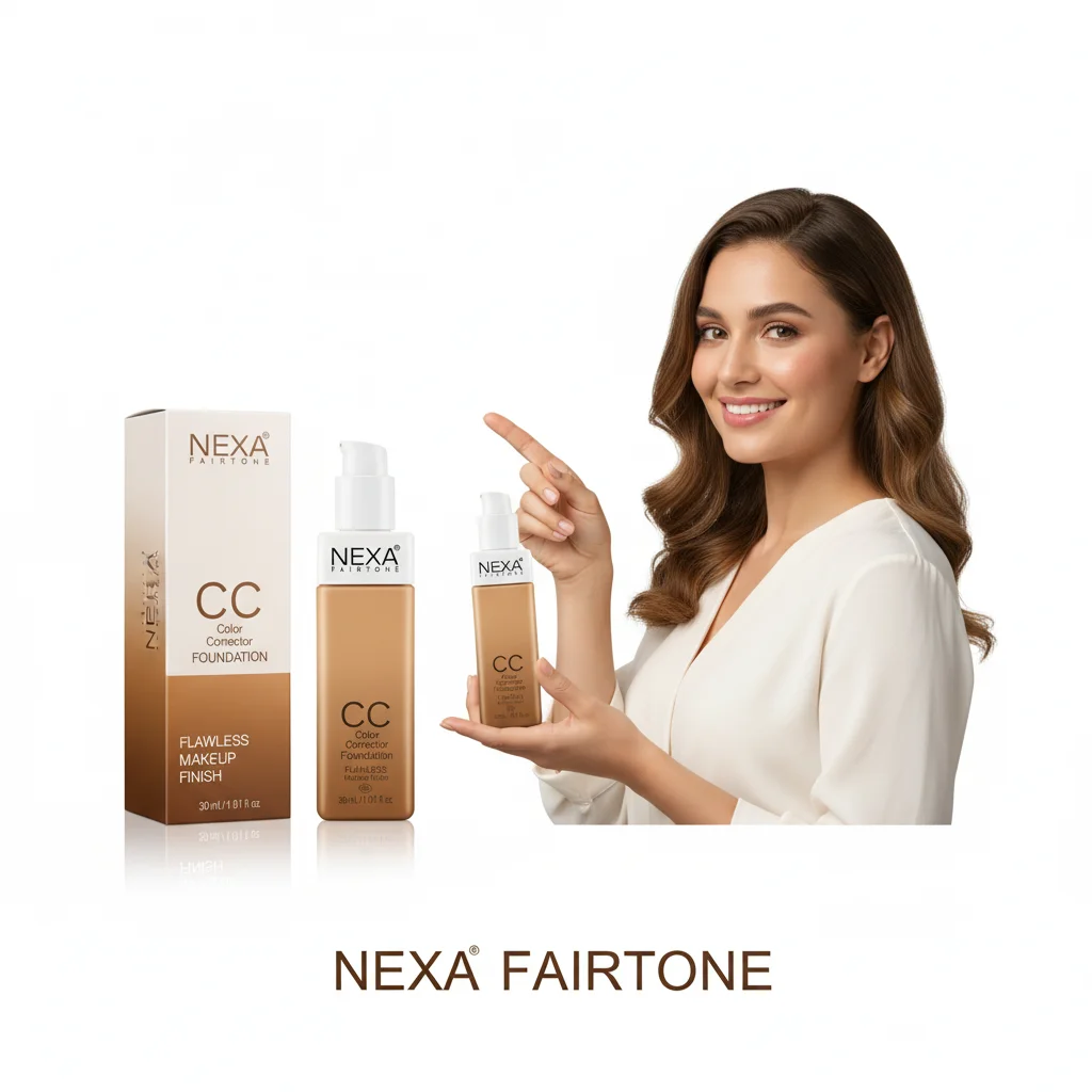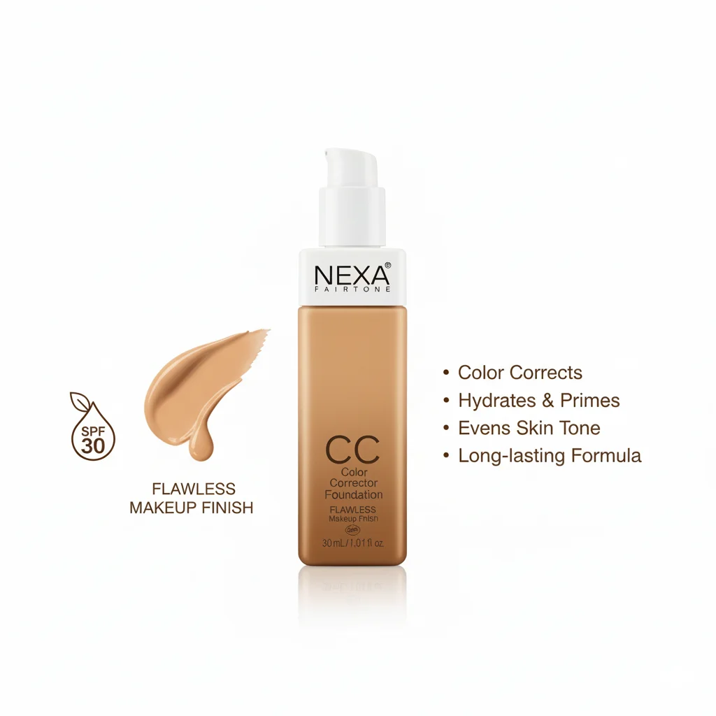 This is a CC (Color Corrector) Foundation from the brand NEXA FAIRTONE. It is housed in a sleek, rectangular bottle with a white pump dispenser and cap, containing 30 ml (1.01 fl oz) of product. The foundation itself is a warm, medium-toned shade, visible through the bottle. The label clearly states “CC Color Corrector Foundation” and highlights its promise of “FLAWLESS Makeup Skin.” There’s also a small “SPF” logo, indicating sun protection, though the specific SPF number is not visible. This product is designed to correct skin tone imperfections while providing coverage and sun protection.
