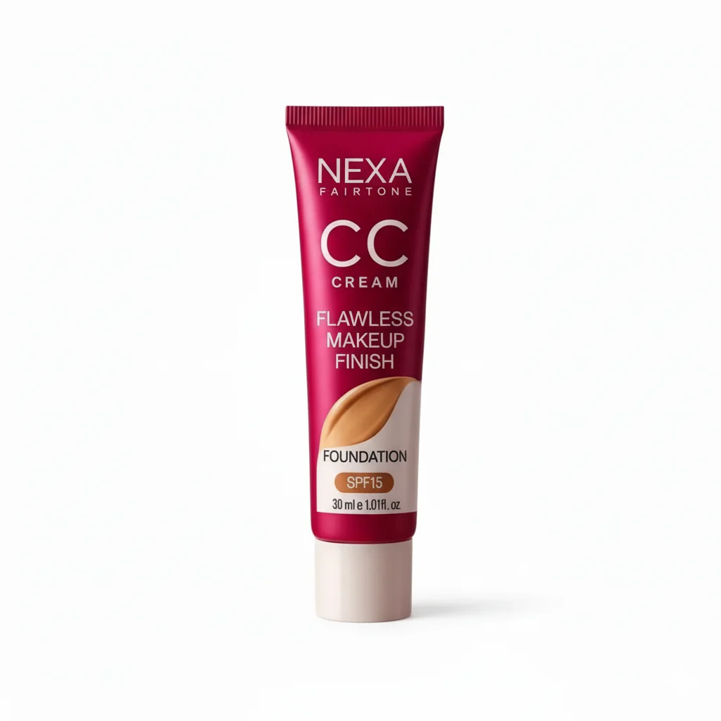 The NEXA Fairtone CC Cream is a multi-functional beauty product that offers a “Flawless Makeup Finish.” It is presented as a “Two In One” product, combining the benefits of a CC cream with a foundation. The packaging, both the tube and the box, is predominantly a rich pink/magenta color with white and gold accents. A key feature is the inclusion of SPF15, providing some sun protection. The product comes in a 30 ml (1.01 fl. oz.) tube. The design emphasizes a smooth, even complexion, indicated by the “Fairtone” and “Flawless Makeup Finish” descriptors, along with a swirl of product representing the foundation color.