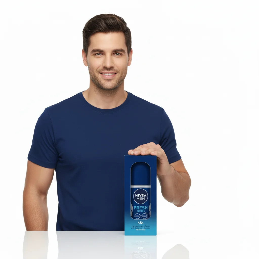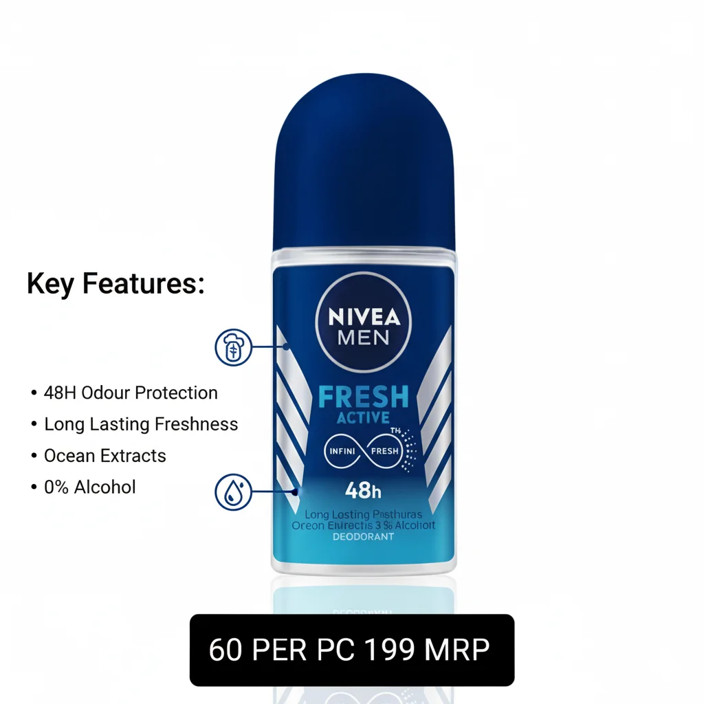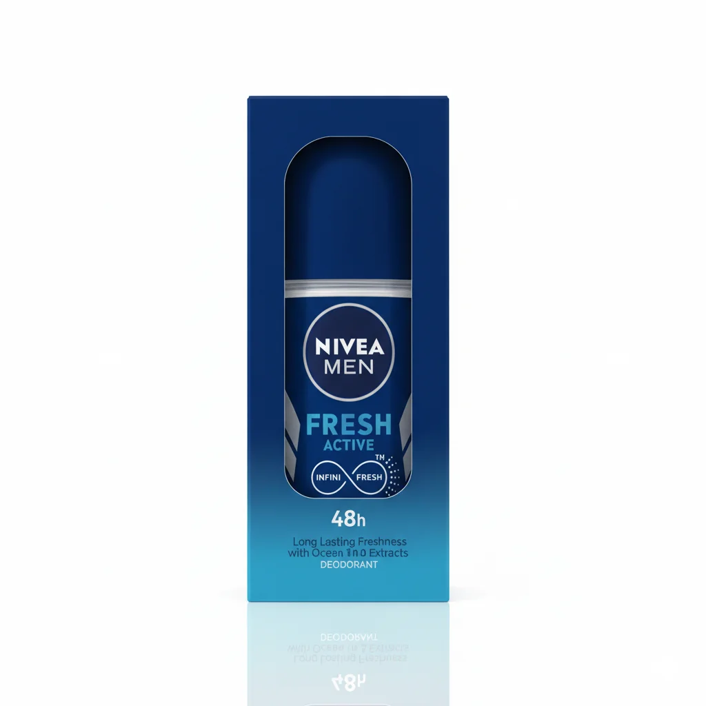 The Nivea Men Fresh Active Deodorant is a roll-on antiperspirant designed to provide men with long-lasting freshness and effective protection against sweat and body odor for up to 48 hours. It is formulated with “Ocean Extracts,” suggesting a refreshing and invigorating scent profile. The packaging highlights its “INFINI FRESH” and “FRESH ACTIVE” qualities, emphasizing continuous and dynamic freshness. The product comes in a dark blue roll-on bottle, encased in a matching blue carton, reflecting the Nivea Men brand aesthetic.