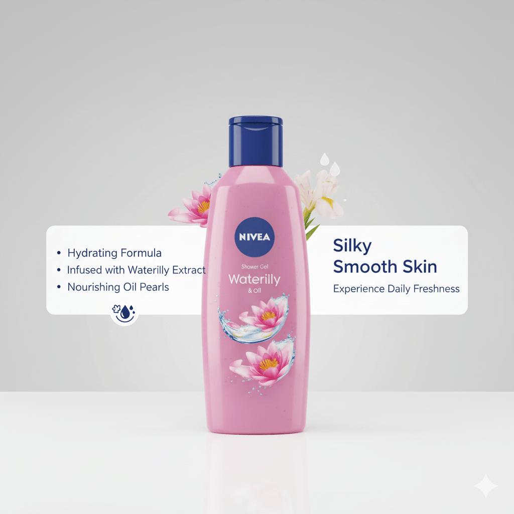 The NIVEA Shower Gel Waterlily & Oil is a gentle and moisturizing body wash designed to provide a refreshing yet nourishing shower experience. This shower gel combines the delicate, fresh scent of waterlily with the caring properties of oil pearls, aiming to leave the skin feeling soft, smooth, and hydrated after each use. The formula is crafted to cleanse effectively without stripping the skin of its natural moisture, making it suitable for daily use. The product’s packaging often features a visually appealing design that highlights the key ingredients, such as waterlilies and water splashes, to convey a sense of freshness and hydration. It comes in a distinctively shaped bottle, typically with NIVEA’s classic blue logo.