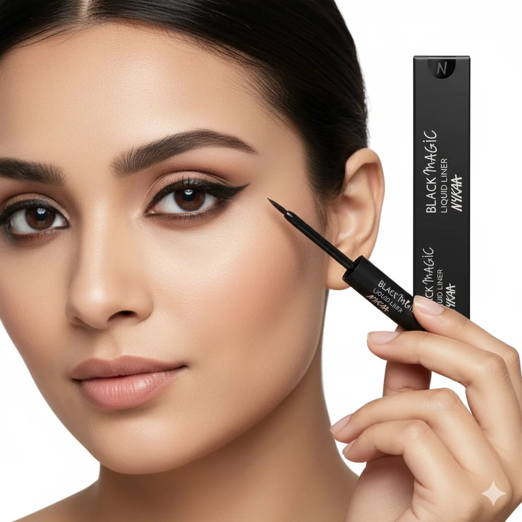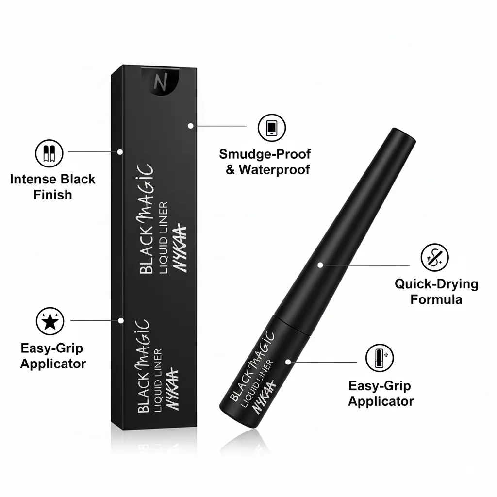 Nykaa’s Black Magic Liquid Eyeliner is designed to deliver bold, well-defined eyes with a single swipe. This intensely pigmented, super black eyeliner glides effortlessly across the lash line for a smooth and fluid application. The specially formulated liner is resistant to melting, cracking, and running, ensuring your look stays flawless throughout the day. Its long-lasting, waterproof, and smudge-proof properties make sure your eye makeup remains impeccable from morning to night.