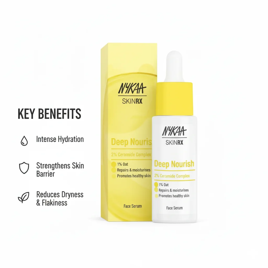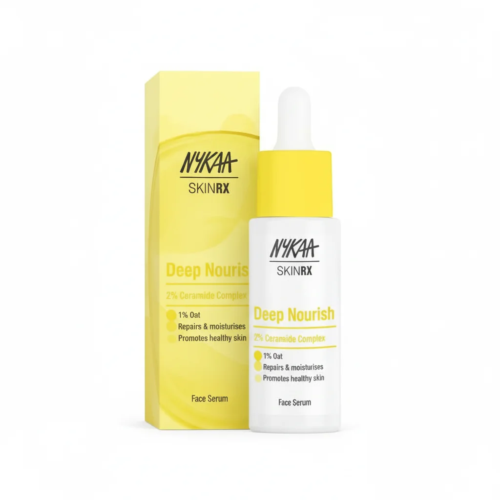 The Nykaa SKINRX Deep Nourish Face Serum is an advanced skincare treatment designed for intensive skin hydration and barrier repair. This serum comes in a sleek, white dropper bottle with a bright yellow cap and label, signifying its focus on nourishment. The packaging highlights its key active ingredients: a 2% Ceramide Complex and 1% Oat. These ingredients are known for their ability to significantly moisturize, repair, and strengthen the skin’s natural barrier. The serum is formulated to combat dryness and flakiness, promoting overall healthy skin. The accompanying box reinforces the product’s benefits and key ingredients.