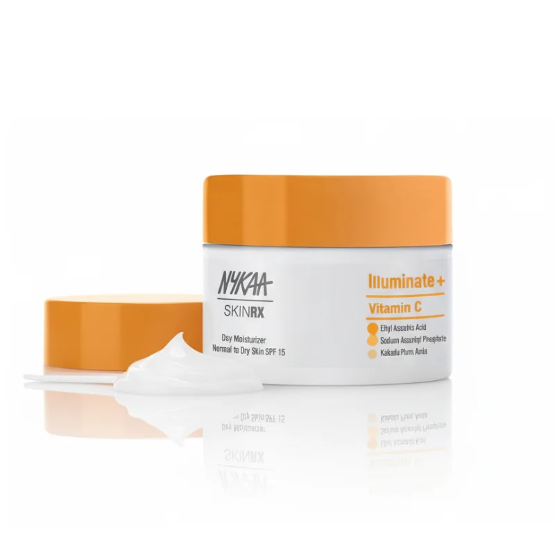 The Nykaa SKINRX Illuminate+ Vitamin C Day Moisturizer is a daily facial moisturizer designed to hydrate and brighten normal to dry skin. It features Vitamin C (specifically Ethyl Ascorbic Acid and Sodium Ascorbyl Phosphate) as a key ingredient, known for its antioxidant properties and ability to help reduce the appearance of dullness and uneven skin tone.