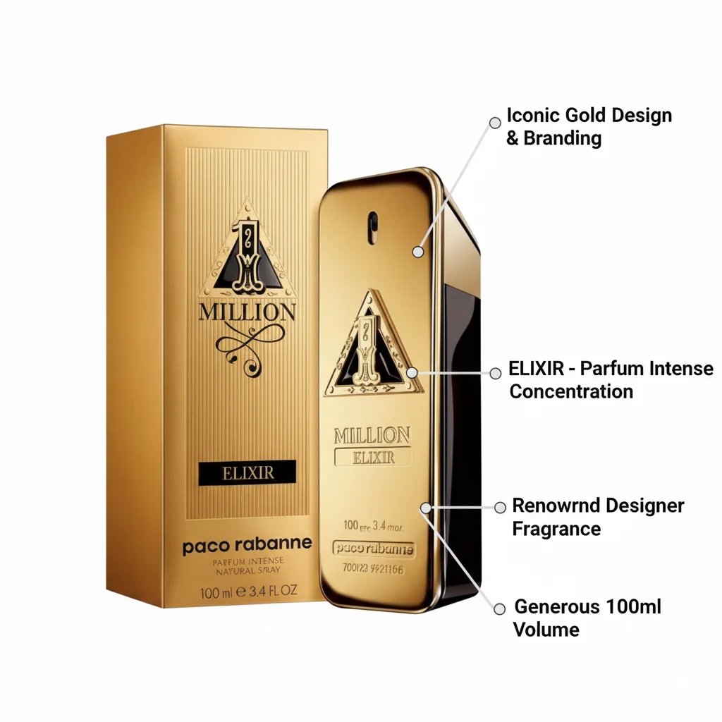 Paco Rabanne 1 Million Elixir Parfum Intense is an opulent and powerful new chapter in the iconic 1 Million saga, pushing the boundaries of intensity and luxury. It’s designed for the man who is bold, magnetic, and lives life to the fullest, a true gold connoisseur. This fragrance is a deeply sensual and addictive woody-amber scent, blending rich fruits and flowers with an enhanced warmth of vanilla and patchouli. It’s an ultra-long-lasting and impactful scent, creating an unforgettable trail. The signature gold ingot bottle is reimagined with a more intense, darker gold and a unique triangle symbol, signifying its potent and premium concentration.