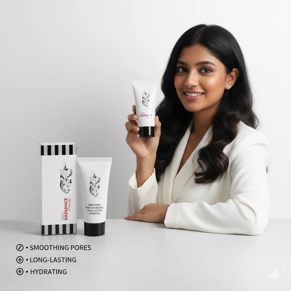 Full Description: The image displays a tube of “Perfect Radiance Primer” alongside its matching box packaging. Both the tube and the box feature a clean, elegant design with a white background. The brand’s aesthetic includes a delicate black floral scroll design (featuring roses and leaves) prominently positioned in the center. Below this, “PERFECT RADIANCE Primer” is written, with “RADIANCE” highlighted in a vibrant pink/magenta color, suggesting a glow-enhancing effect.