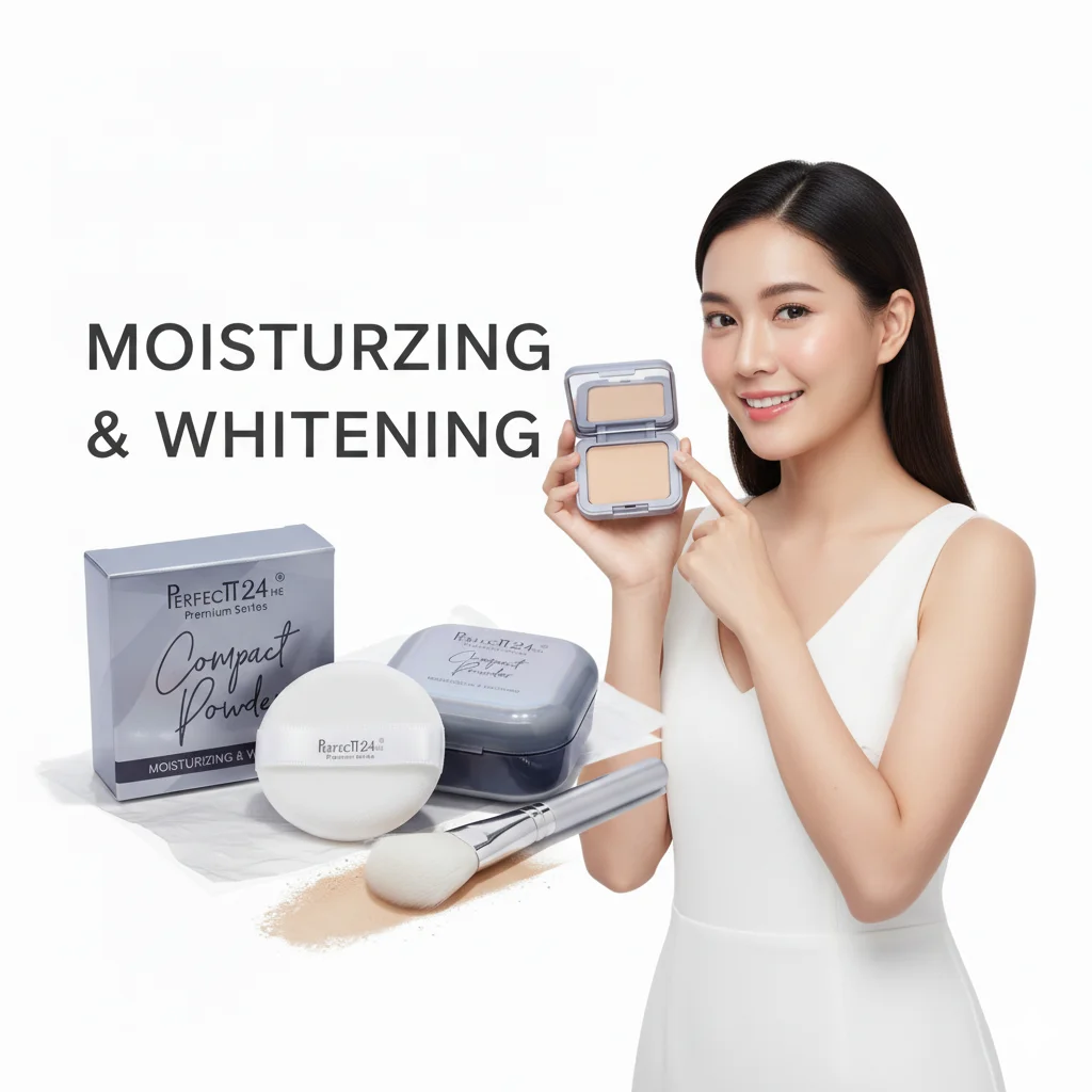 Full Description:This image displays a “PERFECTT 24 PREMIUM BEAUTY HD Studio Finish Compact Powder” set, featuring a stylish magenta-colored box