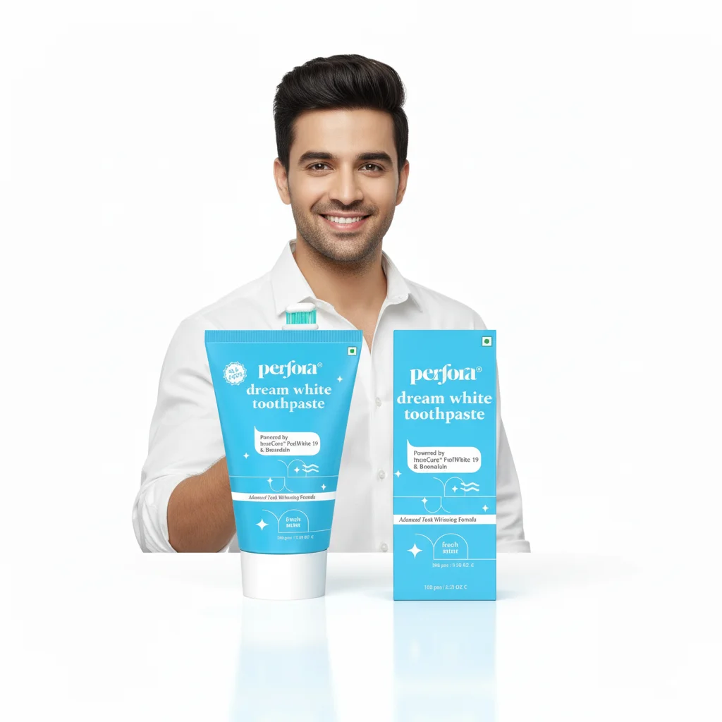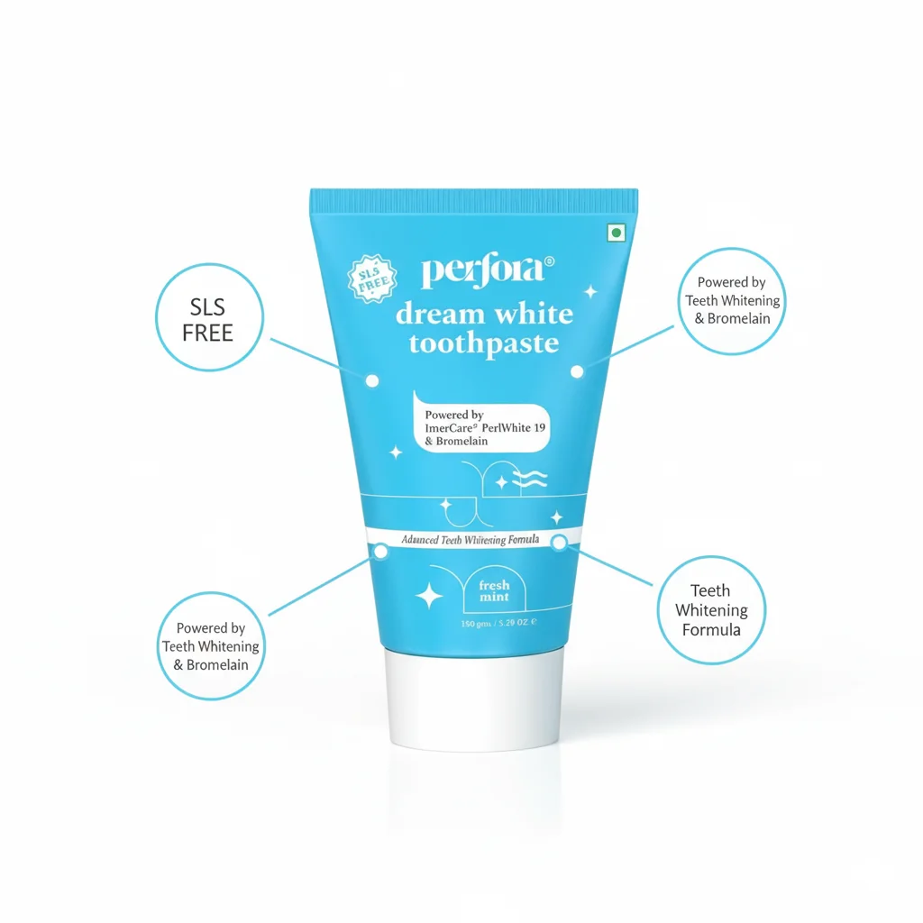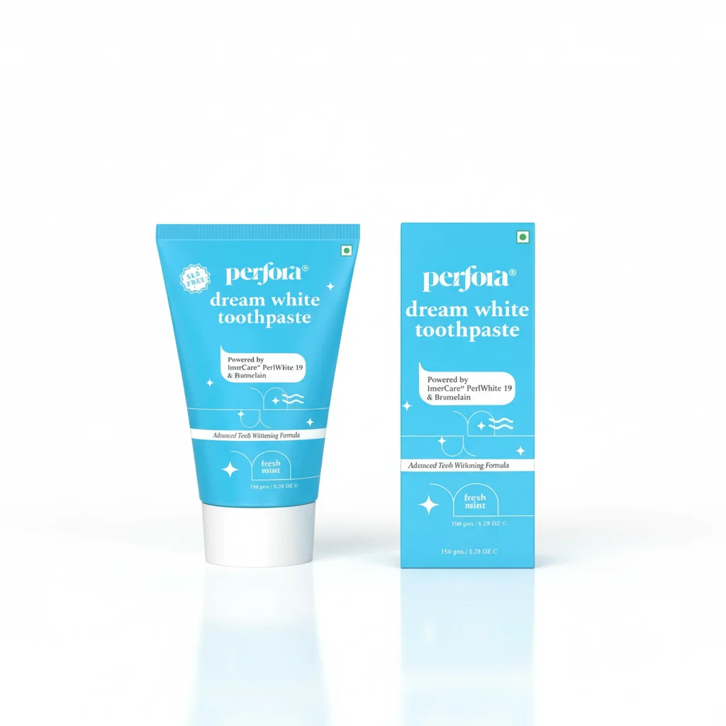 Unveil a brighter, more confident smile with Perfora Dream White Toothpaste. This advanced teeth whitening formula is powered by innovative ingredients like ImerCare® PerlWhite 19 and Bromelain, working synergistically to effectively remove surface stains and reveal the natural whiteness of your teeth. Enjoy the invigorating “fresh mint” flavor that leaves your mouth feeling exceptionally clean and revitalized after every brush. This toothpaste is also SLS-free, ensuring a gentle yet powerful cleaning experience, making it an excellent choice for daily use to achieve and maintain a dazzling white smile.