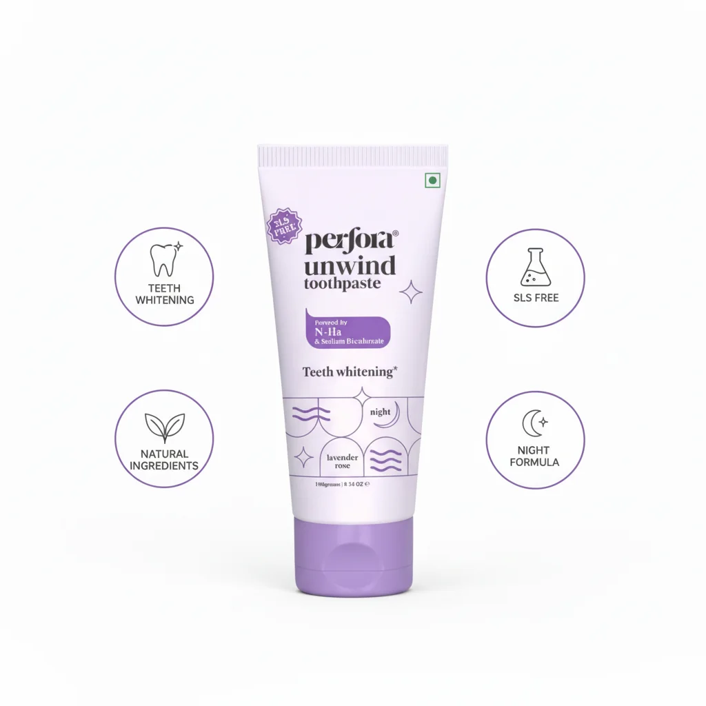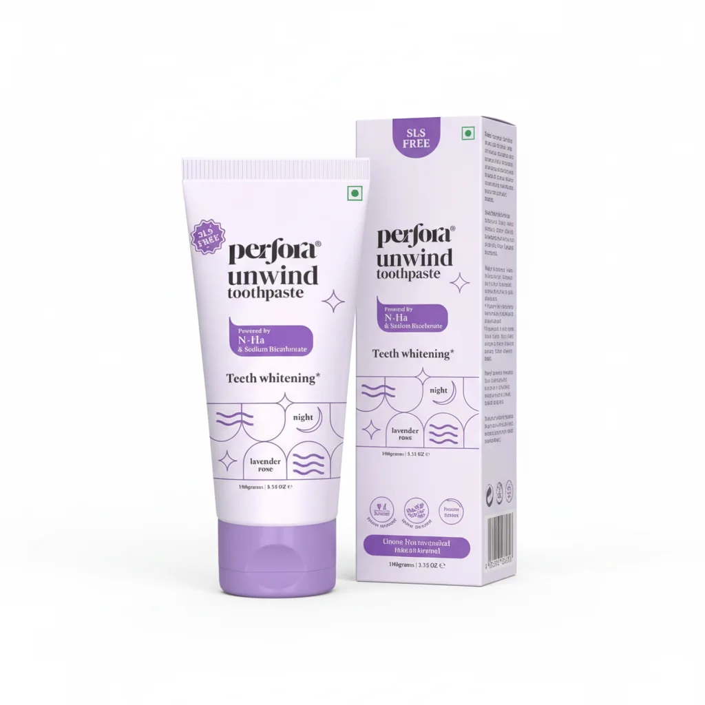 Indulge in a relaxing end to your day with Perfora Unwind Toothpaste, featuring a delicate Lavender Rose flavor. This advanced formula is specifically designed for your nighttime routine, focusing on “Teeth whitening” while you sleep. Powered by N-Ha and Sodium Bicarbonate, it works gently yet effectively to brighten your smile. It’s also SLS-Free, ensuring a mild and soothing experience for your gums and mouth. Let the calming essence of lavender and rose prepare you for a restful night, all while contributing to a visibly brighter and cleaner smile by morning.
