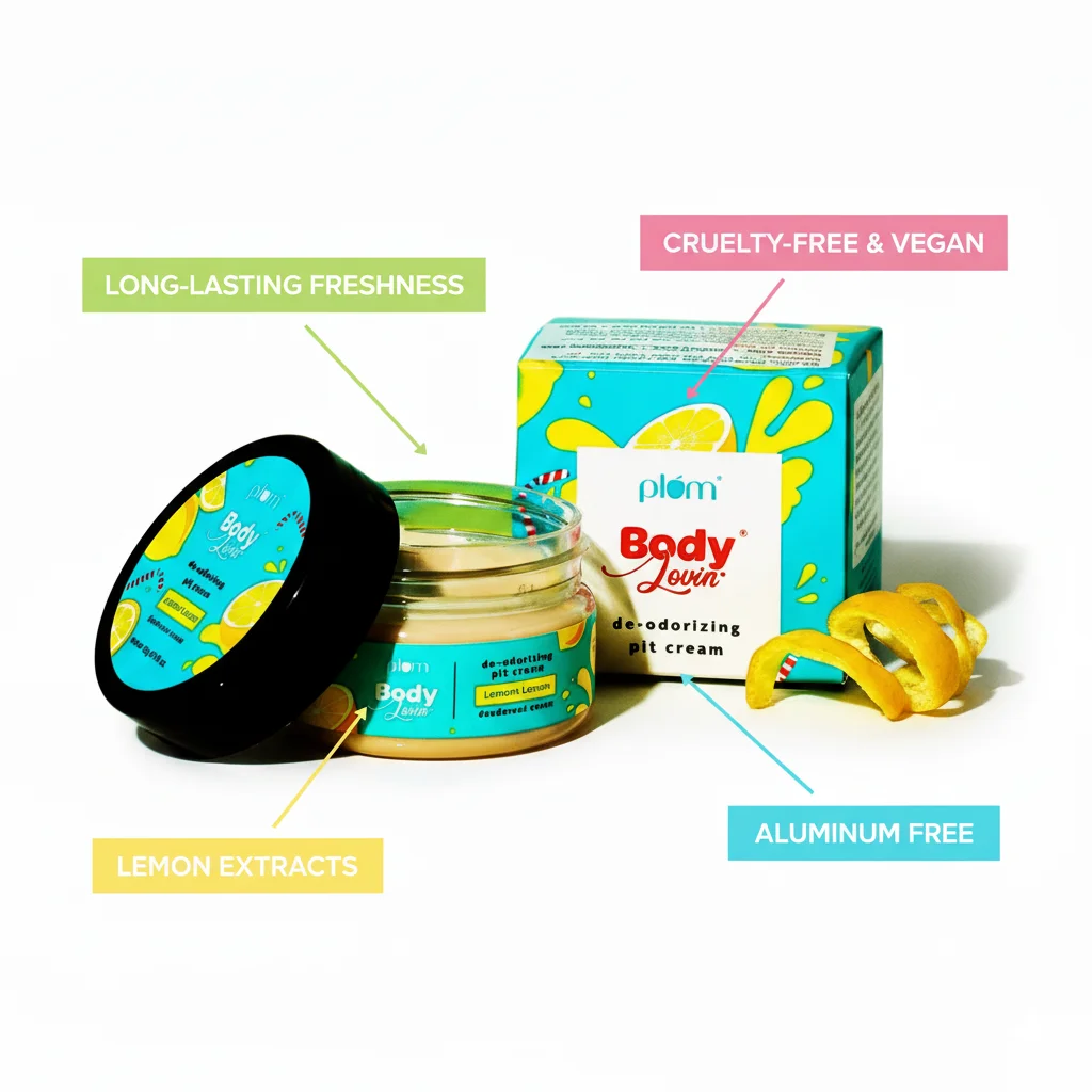 The Plum BodyLovin’ De-odorizing Pit Cream in Lemon Love is a natural, aluminum-free deodorant cream designed to keep underarms fresh and odor-free. It comes in a clear glass jar with a black lid, showcasing the creamy, yellowish product inside. The branding features a vibrant, playful design with lemon illustrations and splashes of yellow and blue. The cream is formulated with a blend of natural ingredients that aim to fight odor-causing bacteria without blocking sweat glands. It boasts a refreshing lemon fragrance. The product is packaged alongside a matching cardboard box, maintaining the same bright and cheerful aesthetic, and a lemon peel garnish is often used in marketing to emphasize its natural lemon scent.