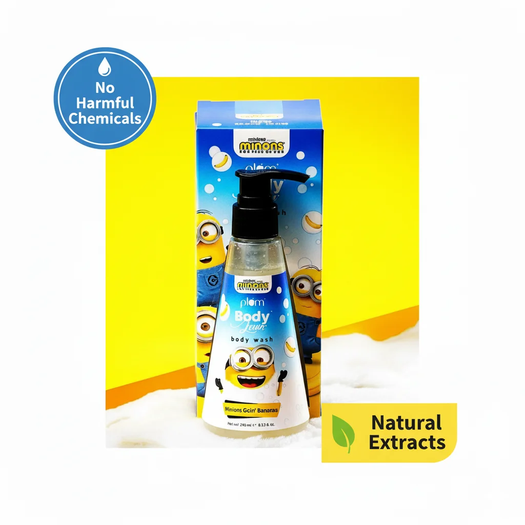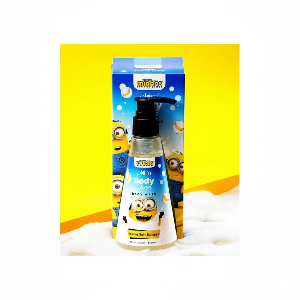 It’s a vibrant and fun body wash featuring popular Minions characters. The product comes in a clear bottle with a black pump dispenser, adorned with Minions imagery, specifically a cheerful Minion at the bottom and scattered bananas. The label clearly states “Plum BodyLovin’ body wash” and indicates the specific variant as “Minions Goin’ Bananas.” The packaging is playful and targeted towards fans of the Minions franchise. The bottle is placed in front of its matching box, which also features a blue background with Minions and banana illustrations, set against a bright yellow backdrop. The product promises a “bananas” scented shower experience.