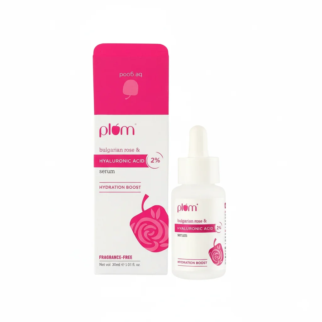 This is a Plum brand serum, specifically formulated with Bulgarian Rose and 2% Hyaluronic Acid. It’s designed to provide a “Hydration Boost” to the skin. The product is fragrance-free, as indicated on the packaging. The bottle contains 30ml (1.01 fl. oz) of serum and comes in a matching pink and white box with a rose illustration.