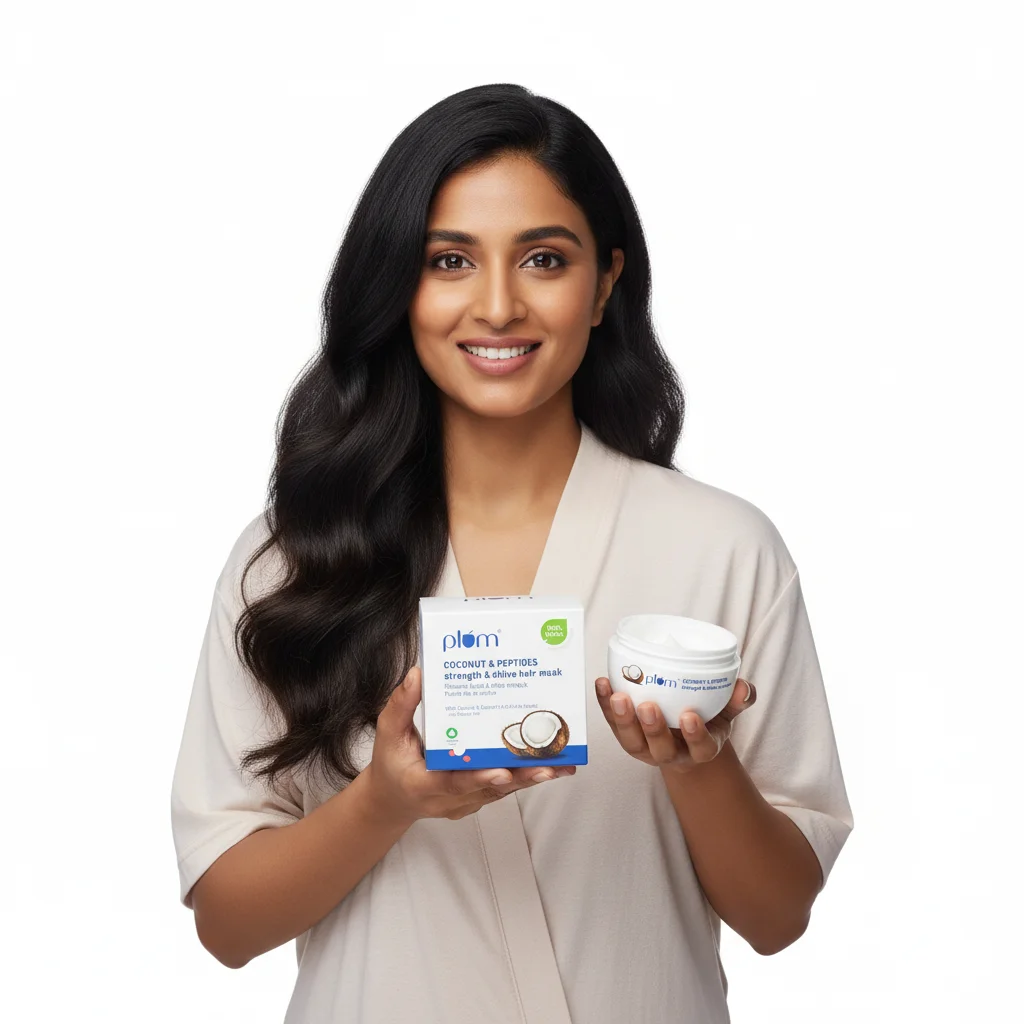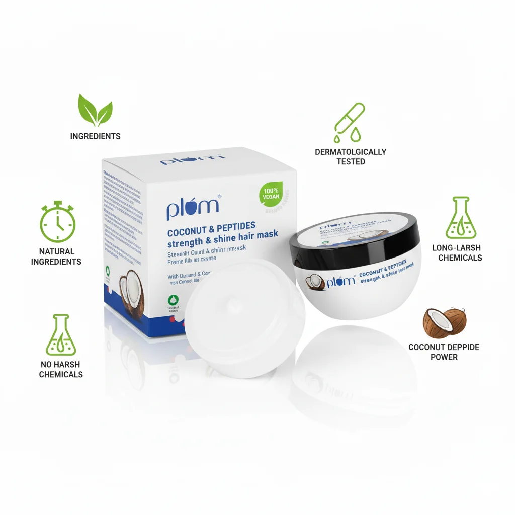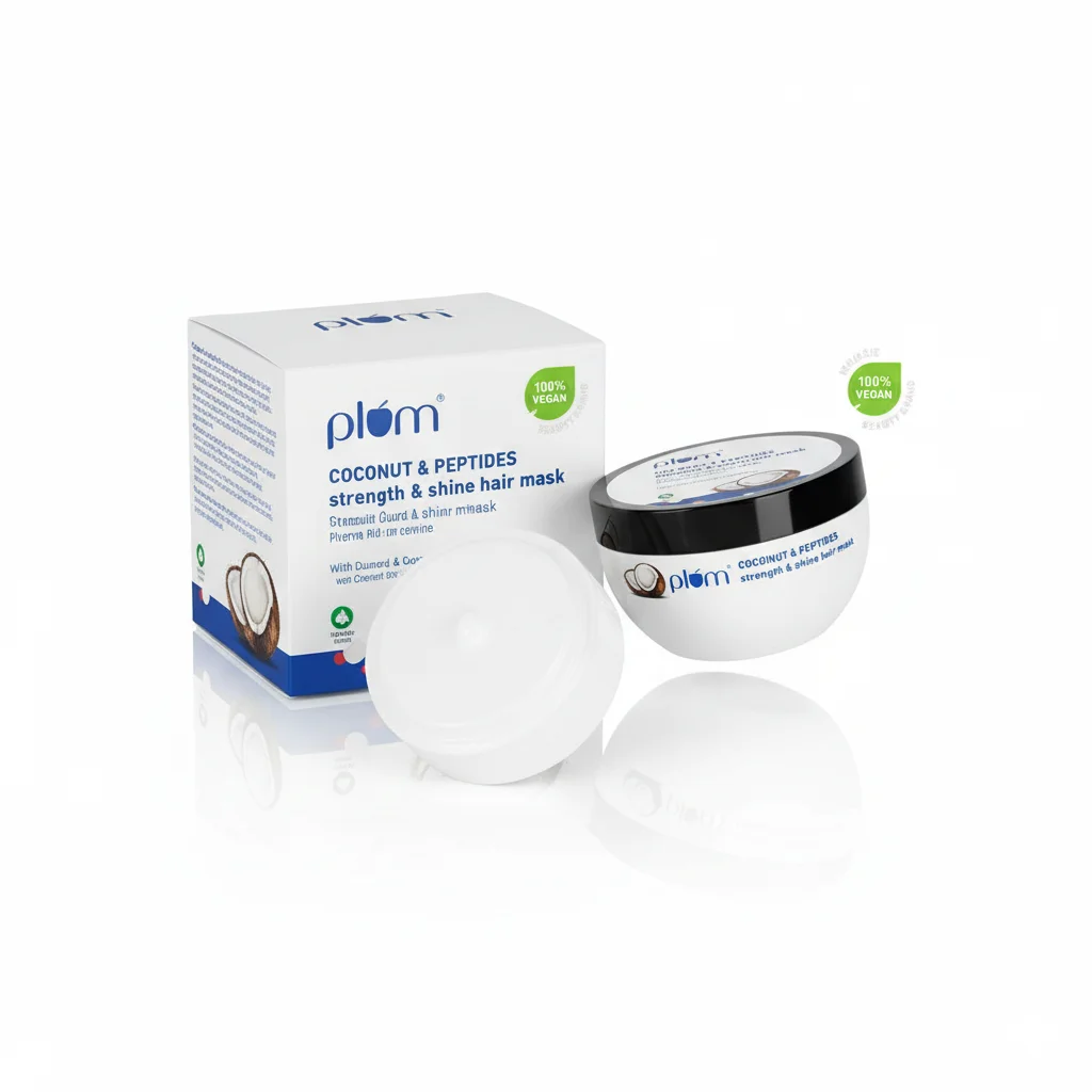 This is a hair mask from the Plum brand, formulated with Coconut and Peptides, designed to provide strength and shine to the hair. The product is marketed as “100% VEGAN,” indicating a commitment to animal-friendly and plant-based ingredients. It comes in a white tub with a black lid, contained within a white cardboard box that reiterates the key features and branding. The packaging also mentions “Duranzi & Coconut for intense hair nourishment,” suggesting a focus on deep conditioning and strengthening benefits. The box indicates that it’s a “strength & shine hair mask” and potentially mentions being “Paraben-free.”