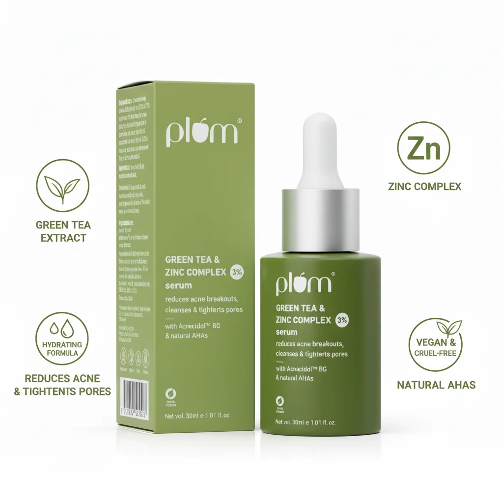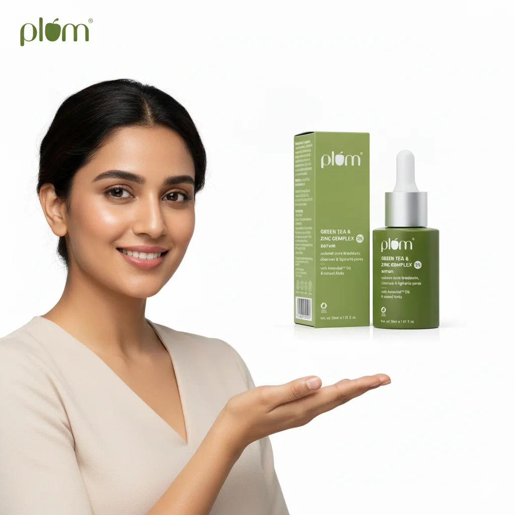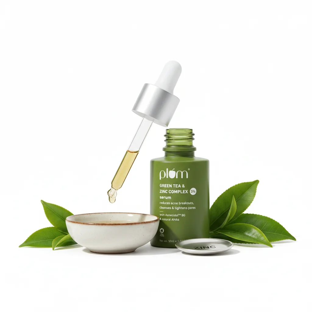 The image prominently features the Plum Green Tea & Zinc Complex 3% Serum, presented in a stylish matte green dropper bottle, reflecting its key ingredient, green tea. The serum itself has a light yellowish hue, visible as a drop delicately falls from the dropper into a small ceramic bowl, surrounded by fresh green tea leaves, emphasizing its natural formulation. This serum is specifically designed for oily, acne-prone skin, leveraging the benefits of a 3% Zinc Complex to help regulate sebum production and reduce acne breakouts. Green Tea, a powerful antioxidant, further contributes by soothing inflammation, fighting free radicals, and preventing future breakouts. The formula also includes natural AHAs to gently exfoliate, cleanse pores, and tighten them, leading to clearer, smoother, and healthier-looking skin. This serum offers a targeted solution for those struggling with blemishes, excess oil, and enlarged pores, while upholding Plum’s commitment to clean, vegan, and cruelty-free skincare.