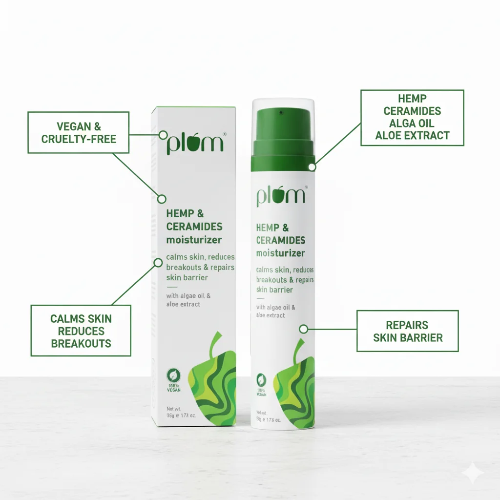 The Plum Hemp & Ceramides Moisturizer is a skincare product designed to address multiple concerns, primarily focused on calming the skin, reducing breakouts, and repairing the skin barrier. Its key ingredients are Hemp and Ceramides, which are known for their restorative and soothing properties. Additionally, it is formulated “with algae oil & aloe extract,” further enhancing its calming and healing benefits. The product is certified “100% VEGAN,” appealing to ethically conscious consumers. It comes in a 50g (1.73 oz.) pump bottle, suggesting a hygienic and easy application, and is presented in a matching white and green carton box, featuring a stylized leaf motif.