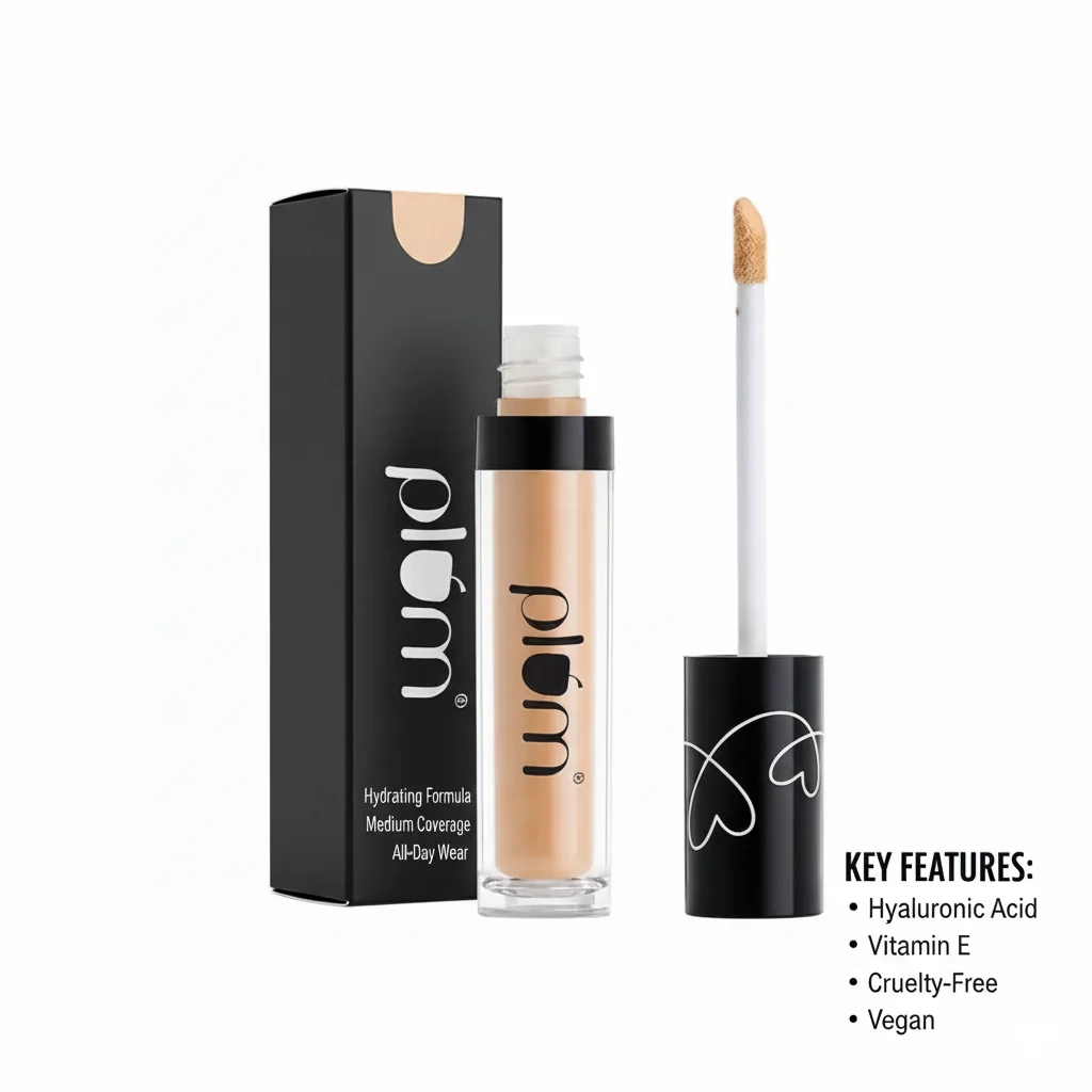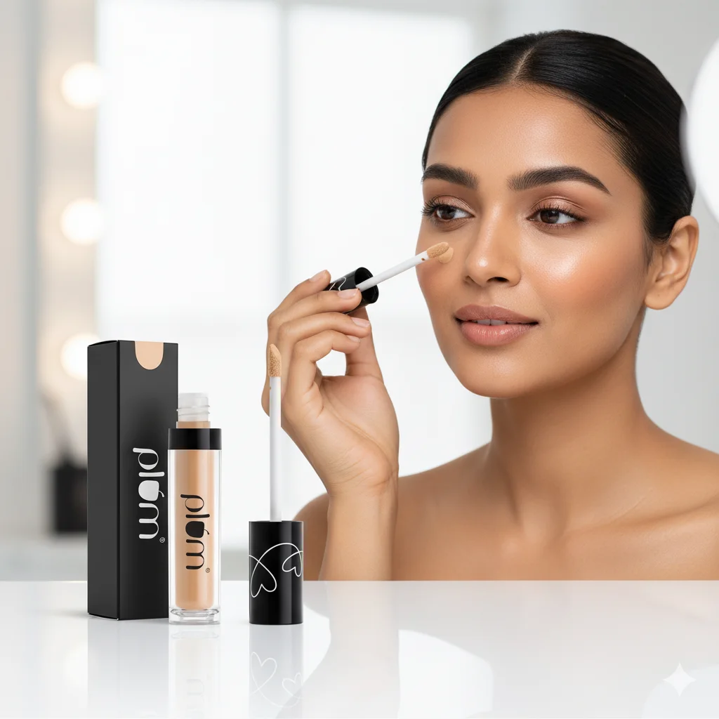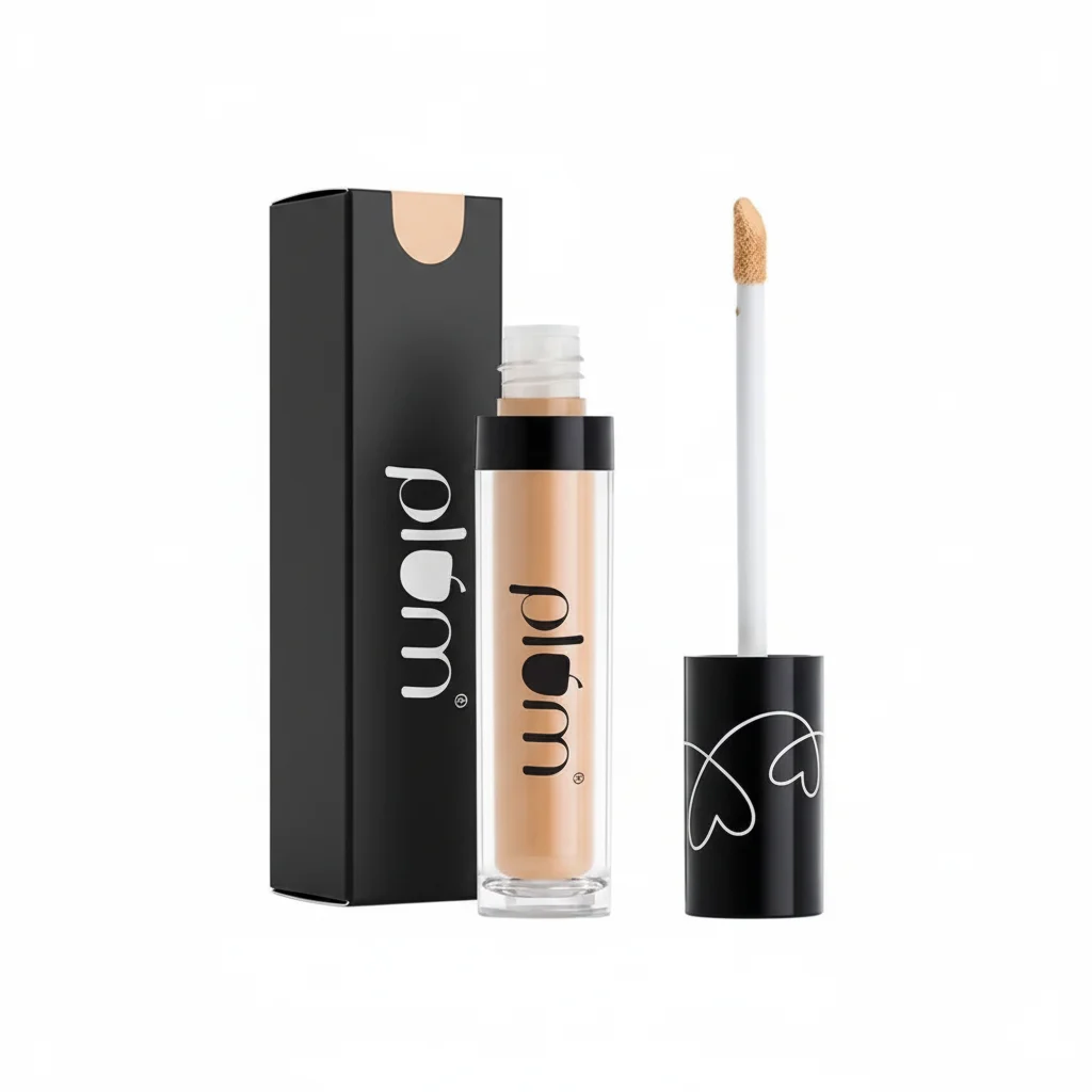 This is a liquid concealer from the Plum brand, presented in a clear tube with a black cap. The product has a light, fair skin tone shade. It comes with a doe-foot applicator attached to the cap, designed for precise application to cover blemishes, dark circles, or uneven skin tone. The packaging includes a sleek black cardboard box, also featuring the white “plum” logo. The branding on the cap of the applicator has a subtle heart-like design, adding a touch of visual interest.
